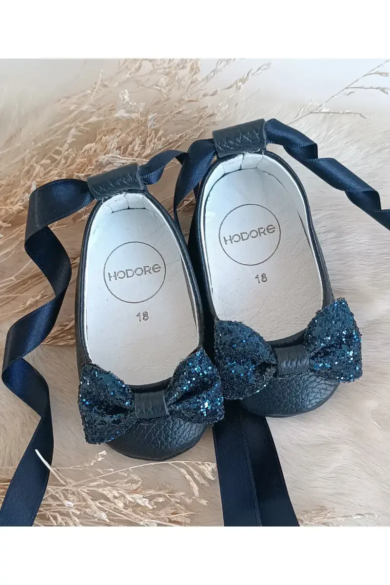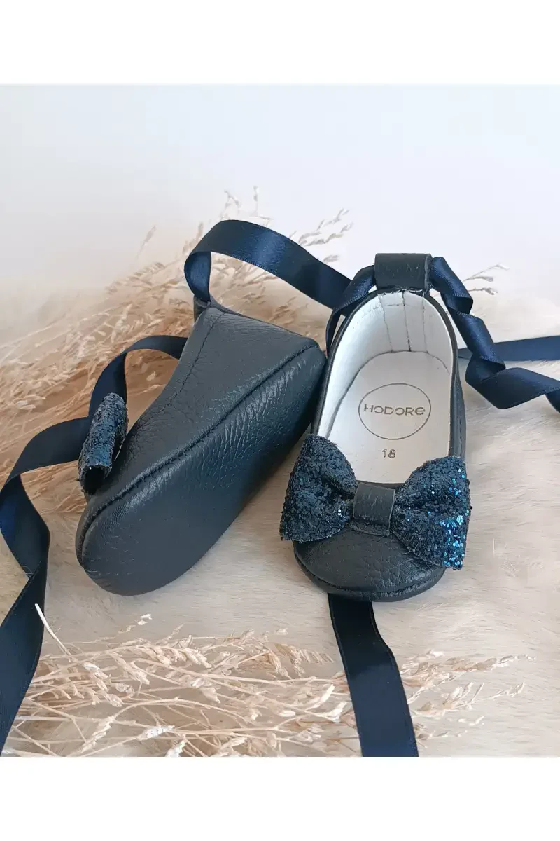 Bebek babet, hakiki deri, lacivert, inci taşlı, el yapımı, düz taban, ilk adım ayakkabısı, Hodore, bebek ayakkabı, deri babet