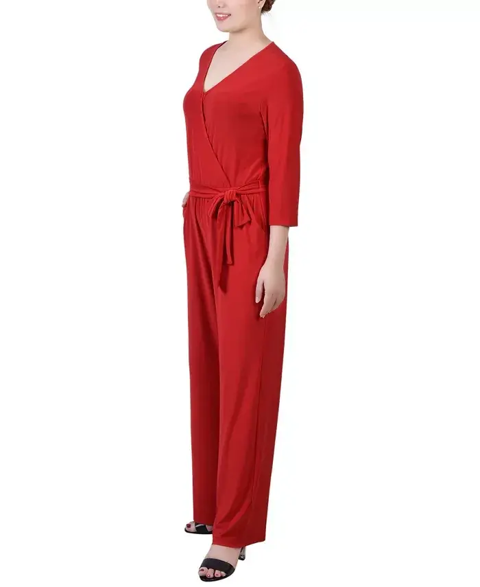 Petite 3/4 Sleeve Belted Wide Leg Jumpsuit-Barbados Red. This jumpsuit is perfect for a night out or a special occasion. The 3/4 sleeves and wide legs are flattering and comfortable, and the belt cinches in your waist for a slimming effect. The jumpsuit is made from a lightweight, breathable fabric that will keep you cool and comfortable all night long.