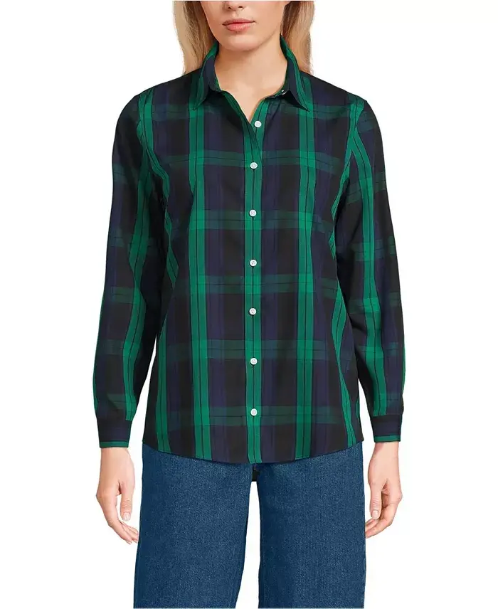 The Lands End Women s No Iron Supima Cotton Long Sleeve Shirt combines the stylish versatility of a classic men's oxford dress shirt with the comfort and ease of soft Supima cotton. Made with your shape and fit in mind the smooth top-notch finishing like clean-finished seams dart shape back and gauntlet style buttons create the tailored lines and flattering silhouette you expect in a dress shirt while the fine Supima fibers and fun patterned prints bring an element of simple pleasure you usually only get to experience on the weekends or from your sleepwear. Our softest-ever no iron finish Fine dress shirt details like clean-finished seams and gauntlet buttons Back darts shape the shirt Shirt fit: Tailored Fit. Garment Closure: Front Button Down. Garment Neckline: Collared. Approx Length: 27 inches. 100% cotton Machine washable Imported