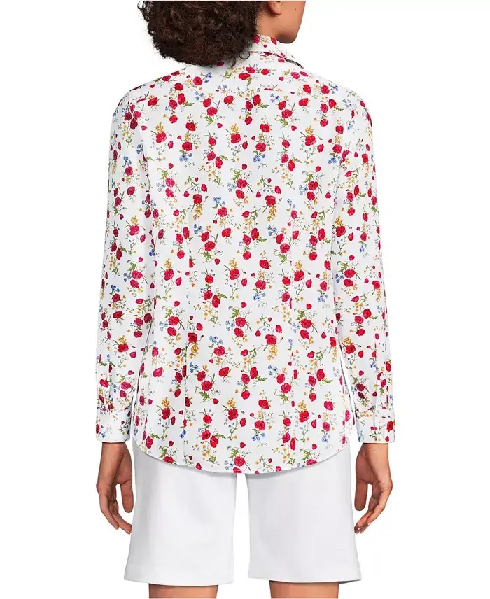 The Lands End Women s No Iron Supima Cotton Long Sleeve Shirt combines the stylish versatility of a classic men's oxford dress shirt with the comfort and ease of soft Supima cotton. Made with your shape and fit in mind the smooth top-notch finishing like clean-finished seams dart shape back and gauntlet style buttons create the tailored lines and flattering silhouette you expect in a dress shirt while the fine Supima fibers and fun patterned prints bring an element of simple pleasure you usually only get to experience on the weekends or from your sleepwear. Our softest-ever no iron finish Fine dress shirt details like clean-finished seams and gauntlet buttons Back darts shape the shirt Shirt fit: Tailored Fit. Garment Closure: Front Button Down. Garment Neckline: Collared. Approx Length: 27 inches. 100% cotton Machine washable Imported