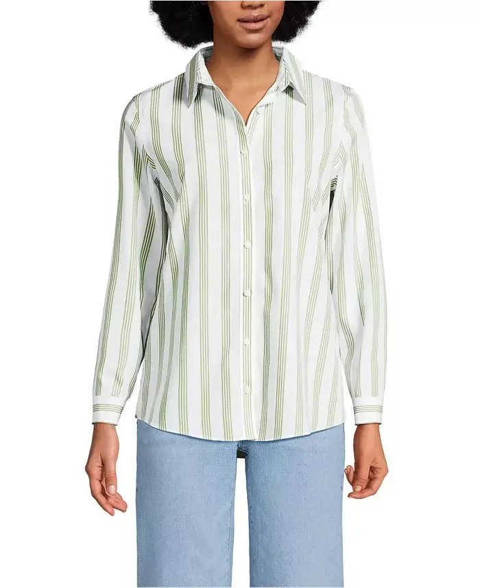 The Lands End Women s No Iron Supima Cotton Long Sleeve Shirt combines the stylish versatility of a classic men's oxford dress shirt with the comfort and ease of soft Supima cotton. Made with your shape and fit in mind the smooth top-notch finishing like clean-finished seams dart shape back and gauntlet style buttons create the tailored lines and flattering silhouette you expect in a dress shirt while the fine Supima fibers and fun patterned prints bring an element of simple pleasure you usually only get to experience on the weekends or from your sleepwear. Our softest-ever no iron finish Fine dress shirt details like clean-finished seams and gauntlet buttons Back darts shape the shirt Shirt fit: Tailored Fit. Garment Closure: Front Button Down. Garment Neckline: Collared. Approx Length: 27 inches. 100% cotton Machine washable Imported