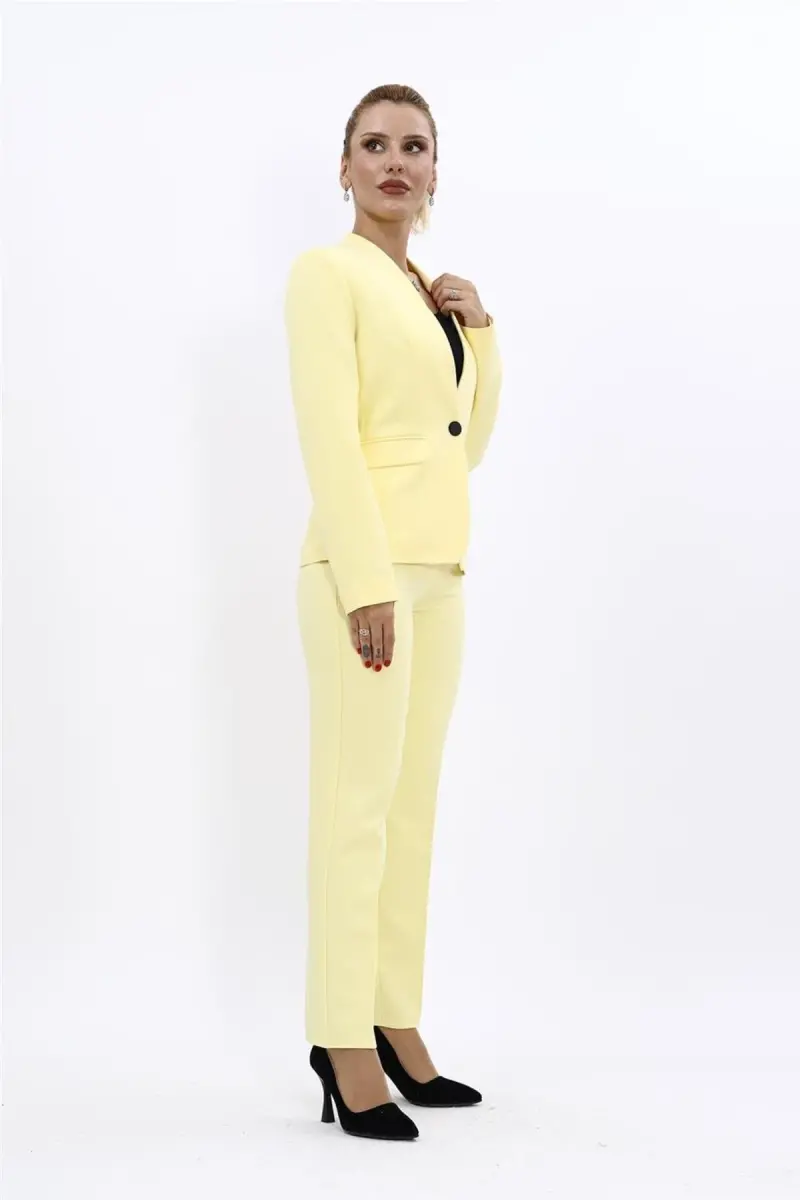 Этот костюм, состоящий из жакета без воротника на одной пуговице и брюк-дудочек, — идеальный выбор для женщин, которые хотят создать современный и элегантный силуэт. Яркость желтого цвета добавляет энергии вашему образу, а дизайн без воротника и деталь с одной пуговицей придают жакету неповторимый вид. Брюки-дудочки сочетают в себе комфорт и элегантность. Этот костюм подходит для широкого спектра мероприятий, от специальных мероприятий до деловых встреч. Качественная подкладка, использованная во внутренней части жакета, обеспечивает комфорт в течение всего дня, а потайная молния и застежка-крючок на поясе брюк помогут вам создать безупречный образ. Специальная смесь, используемая в ткани костюма, повышает устойчивость к сминанию и позволяет вам всегда выглядеть ухоженно. Вы можете выразить свой собственный стиль, сочетая его с разными оттенками желтого, и дополнить свой образ аксессуарами. Независимо от того, создаете ли вы шикарный образ с туфлями на каблуках или более непринужденный стиль с кроссовками, этот костюм будет сопровождать вас в любой ситуации. Этот стильный и удобный костюм станет одним из самых любимых предметов вашего гардероба.