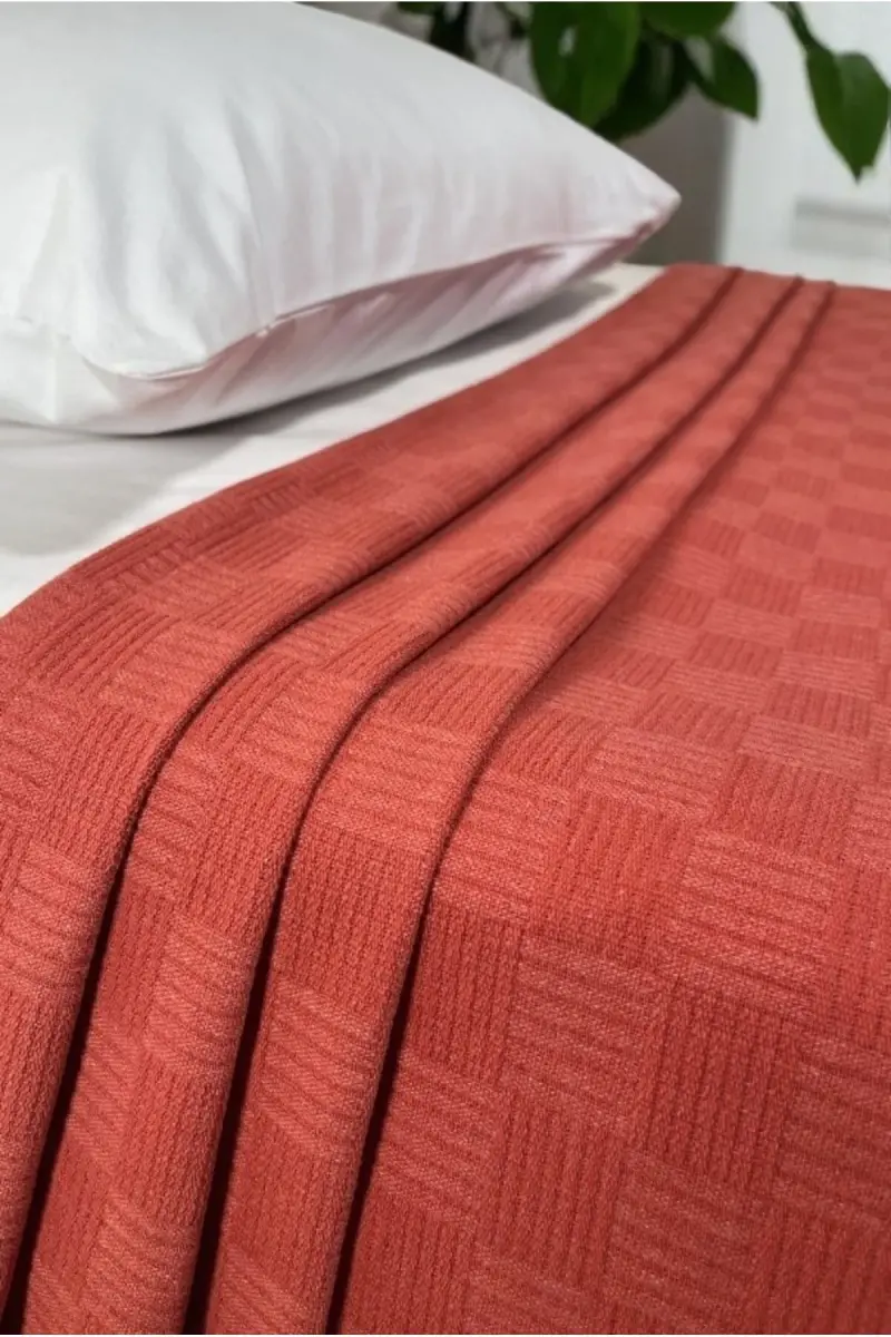 çift kişilik pike, pamuk pike, yatak örtüsü, otel tipi pike, kiremit rengi, dama desenli, 240x260, yazlık pike, dekoratif örtü, pamuk yatak örtüsü