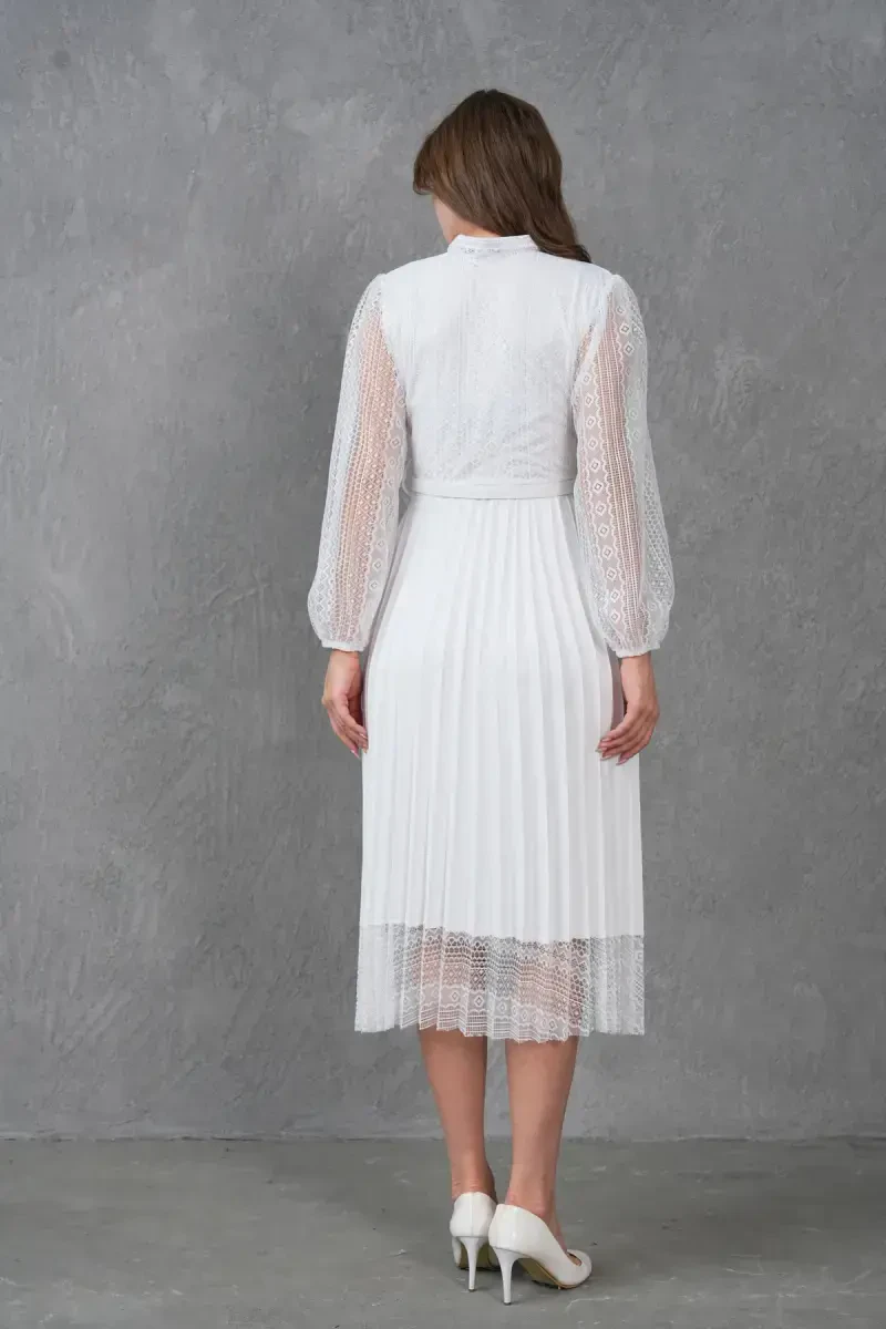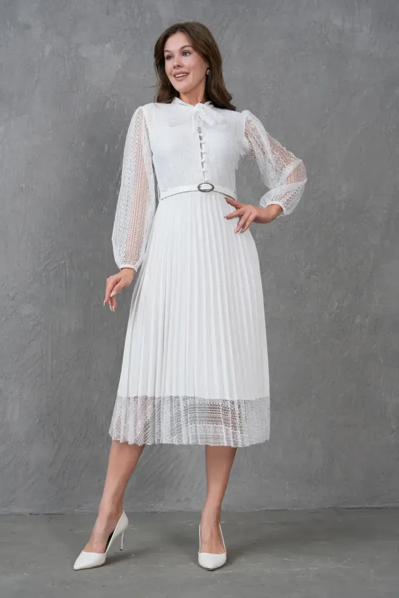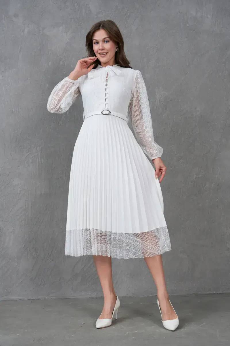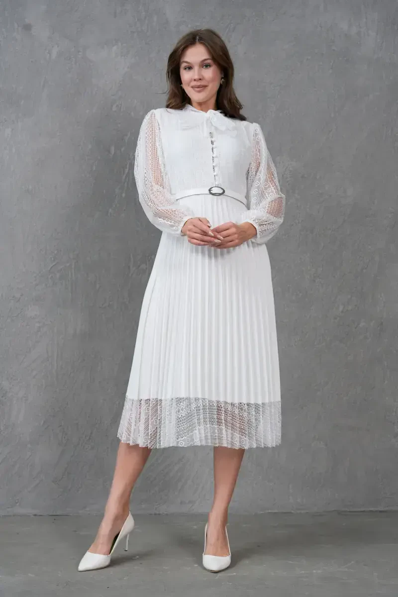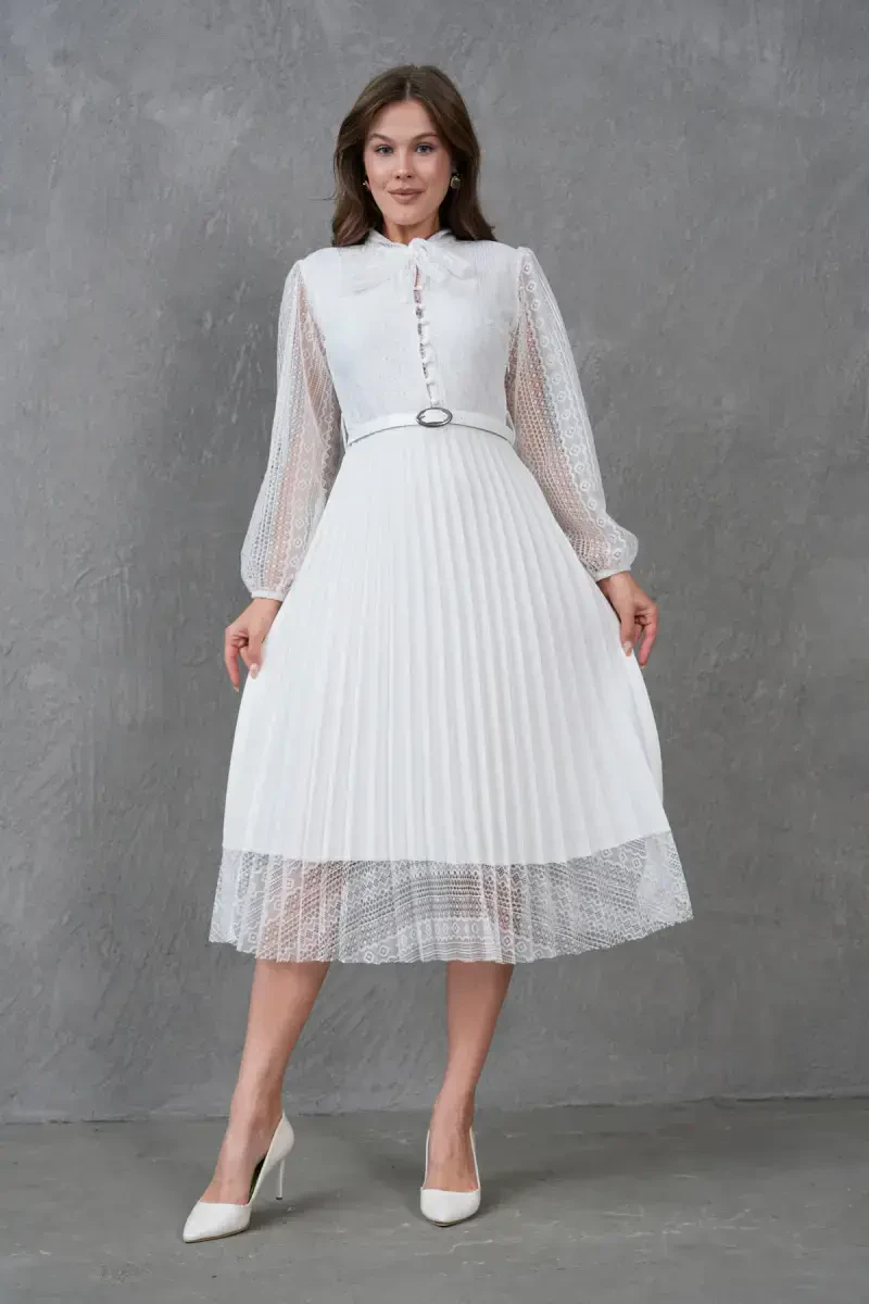 Pilise Detalli Kamarli Dizayn Uzun Yengli Oq Krujevali Abiye Ko'ylak, maxsus kunlaringizda nafosatingiz bilan hayratga solishingizga yordam beradigan, ko'zni qamashtiruvchi tanlovdir. Ushbu ajoyib ko'ylak, detallarga e'tibor bilan ishlangan krujeva matosi, zamonaviy pilise detallari va tana chiziqlaringizni mukammal tarzda ochib beradigan kamarli dizayni bilan ajralib turadi. Uzun yengli dizayni, ham nafis ko'rinishni taqdim etadi, ham sovuq havoda sizga qulaylik yaratadi. Oq rangning olijanob va abadiy rangi, ko'ylakka nafislik baxsh etsa, krujeva naqshlari romantik va ayollik tuyg'usini qo'shadi. Ko'ylakning pilise detallari, harakatlanuvchi va dinamik ko'rinishni yaratib, har bir qadamingizda nafosatingizni ta'kidlaydi. Kamarli dizayn, belingizni ingichka qilib, tana chiziqlaringizni yanada aniqroq qiladi va siluetingizni mukammallashtiradi. Yuqori sifatli krujeva matosi, ko'ylakka hashamatli tuyg'u beradi, ichki astar esa kun bo'yi qulay foydalanishni ta'minlaydi. Ushbu abiye ko'ylak, nishon, to'y, bitiruv marosimlari, ziyofatlar va boshqa maxsus tadbirlar uchun ajoyib tanlovdir. Zamonaviy poshnali oyoq kiyimi, nafis sumka va yorqin taqinchoqlar bilan birlashtirib, kechaning eng zamonaviy ayoli bo'lishingiz mumkin. O'zingizni maxsus va go'zal his qilishni istagan har bir daqiqada, bu ko'ylak garderobingizning ajralmas qismiga aylanadi. Pilise Detalli Kamarli Dizayn Uzun Yengli Oq Krujevali Abiye Ko'ylak bilan unutilmas xotiralar to'plang va nafosatingiz bilan hamma hayratga soling. Har bir detalida e'tibor va sifat mujassam bo'lgan bu ko'ylak, maxsus kunlaringizda sizga hamroh bo'lish uchun mo'ljallangan. Shiq va qulaylikni birga taqdim etadigan ushbu noyob buyum, garderobingizda albatta bo'lishi kerak bo'lgan sarmoyadir.