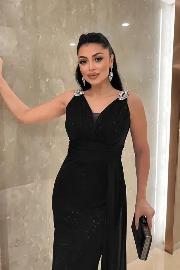 Pırıltılı Taş Detaylı Siyah Abiye Elbise | Şık ve Göz Alıcı