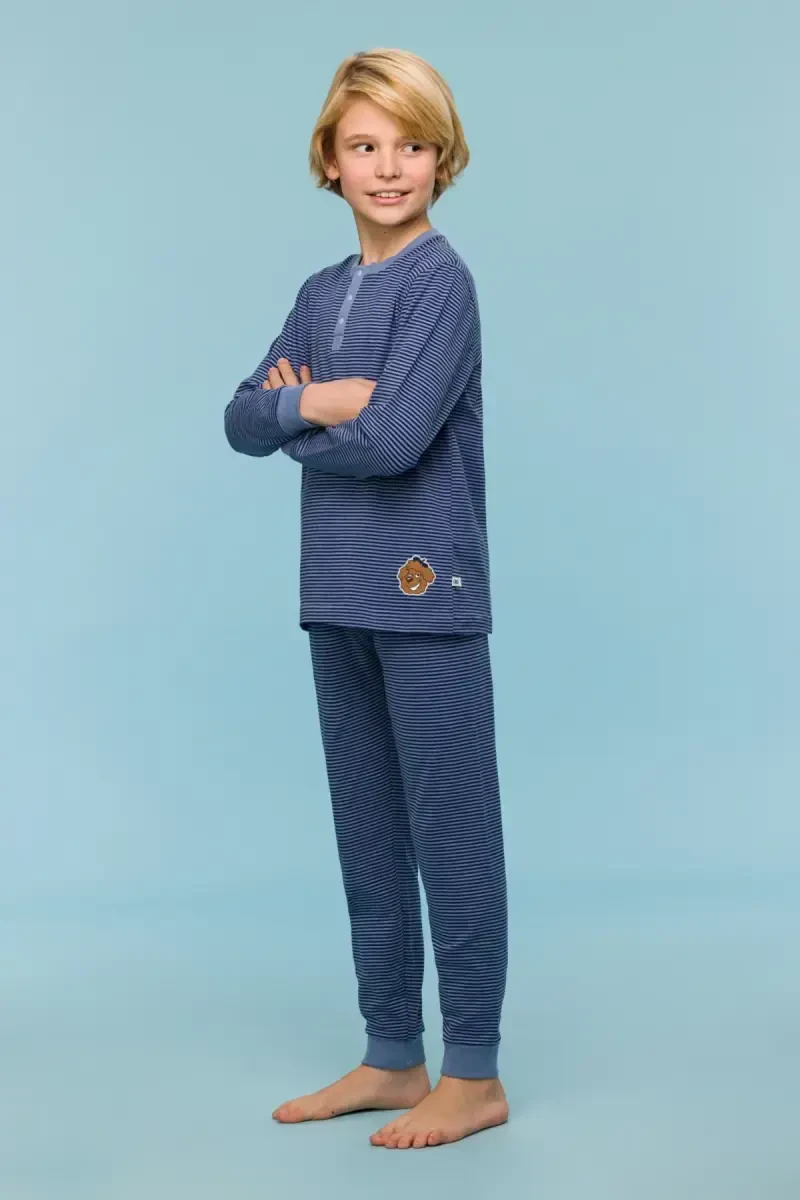 Пижама для мальчиков 10-16 лет - 904-Полосатая синяя, разработанная для того, чтобы ваш ребенок спал комфортно и стильно ночью, изготовлена из мягкой и воздухопроницаемой хлопчатобумажной ткани. Ее полосатый синий дизайн отражает стиль вашего ребенка, а удобный крой и эластичная ткань обеспечивают свободу движений. Пижама состоит из комбинации рубашки с длинным рукавом и длинных брюк, идеально подходит для согрева в холодные ночи.