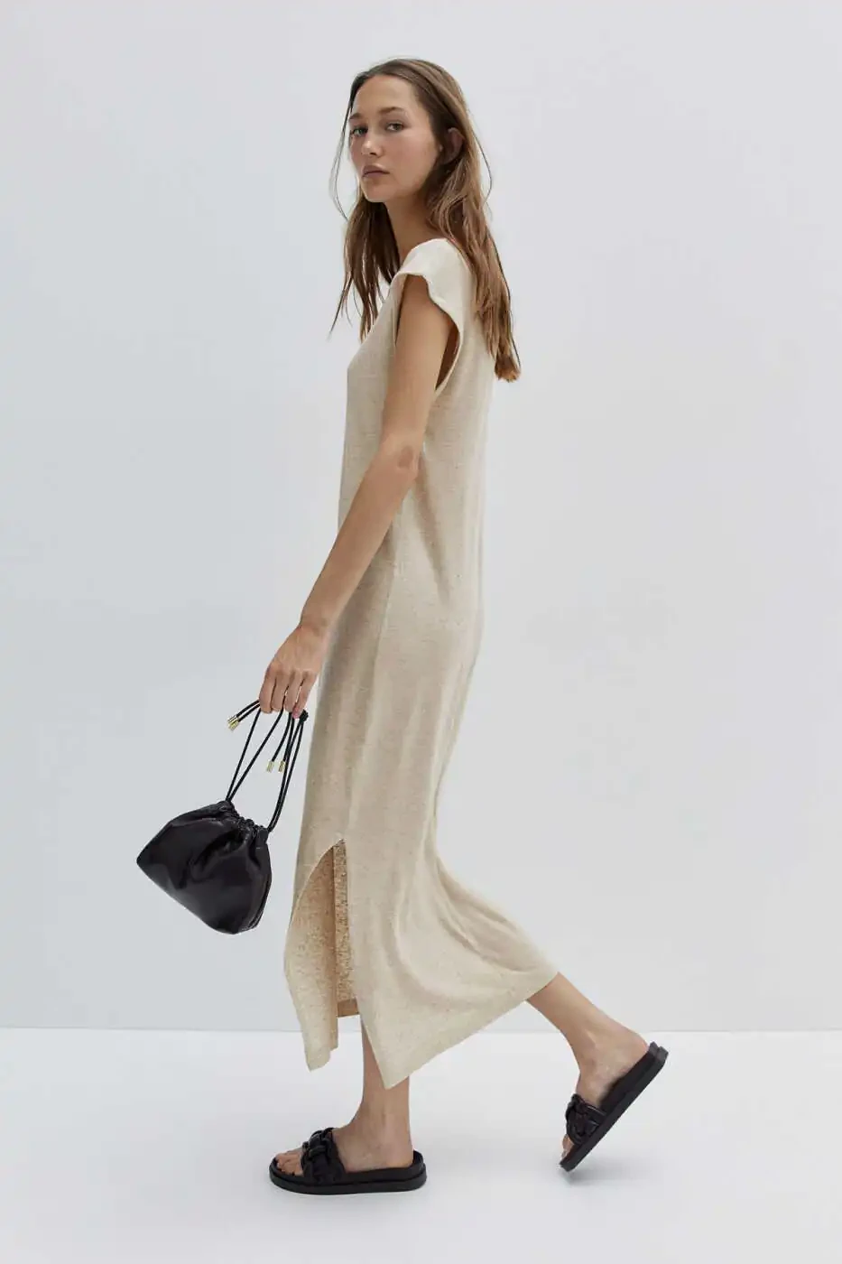Естественная текстура льна в сочетании с хлопком придает платью мягкость и гибкость, а также обеспечивает его долговечность и долговечность. Лен, особенно предпочтительный в летние месяцы, благодаря своей не потеющей структуре сохраняет прохладу и комфорт. Миди-длина платья идеально подходит как для повседневной носки, так и для особых случаев.