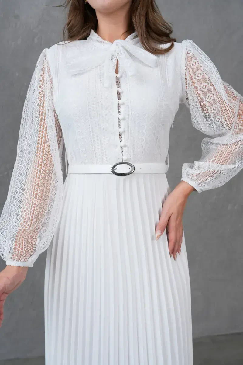Плиссированное платье с поясом, длинными рукавами и белым кружевом - это эффектный вариант для особых случаев, который позволит вам очаровать всех своей элегантностью. Это великолепное платье привлекает внимание тщательно выполненной кружевной тканью, элегантными плиссированными деталями и дизайном с поясом, который идеально подчеркивает ваши формы. Длинные рукава обеспечивают элегантный внешний вид и комфорт в прохладную погоду. Благородный и вневременной белый цвет придает платью изысканный вид, а кружевные вставки добавляют романтичности и женственности. Плиссированные детали платья создают подвижный и динамичный вид, подчеркивая вашу элегантность с каждым шагом. Дизайн с поясом подчеркивает талию, делая ваши формы более выразительными и совершенствуя силуэт. Высококачественная кружевная ткань придает платью роскошный вид, а подкладка обеспечивает комфорт при ношении в течение всего дня. Это платье идеально подходит для помолвки, свадьбы, выпускного вечера, светских приемов и других специальных мероприятий. Вы можете скомбинировать его с элегантными туфлями на каблуке, изящной сумочкой и сверкающими украшениями и стать самой стильной женщиной вечера. Это платье станет незаменимой вещью в вашем гардеробе для любого случая, когда вы хотите почувствовать себя особенной и красивой. Создавайте незабываемые воспоминания в плиссированном платье с поясом, длинными рукавами и белым кружевом и очаровывайте всех своей элегантностью. Это платье, выполненное с вниманием к деталям и качеству, создано для того, чтобы сопровождать вас в особые дни. Этот уникальный предмет одежды, сочетающий в себе элегантность и комфорт, обязательно должен быть в вашем гардеробе.