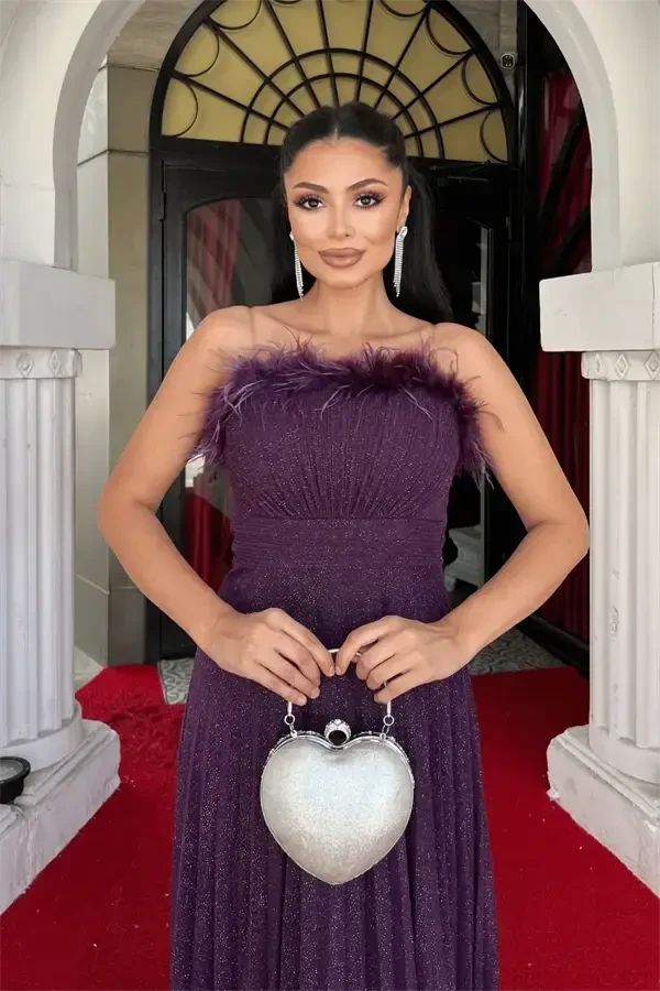 Вечернее платье из тюля с блестками, отделкой из плиссе и воротником с отделкой из перьев - БАКЛАЖАНОВЫЙ ФИОЛЕТОВЫЙ - это элегантный и стильный вариант, который привлечет всеобщее внимание на ваших особых мероприятиях и вечеринках. Очаровательный тон баклажанового фиолетового в сочетании с блеском тюля с блестками заставит вас сиять, как звезда. Привлекательная деталь воротника платья украшена перьями, что придает ему женственный и изысканный вид. Плиссированные детали придают платью движение и плавность, подчеркивая вашу элегантность с каждым шагом.Это вечернее платье изготовлено из высококачественного тюля с блестками. Ткань имеет как стильный вид, так и обеспечивает комфорт в течение всего дня. Подкладка внутри предотвращает плотное прилегание платья к телу и ощущение дискомфорта. Застежка-молния сзади вечернего платья позволяет легко надевать и снимать его, сохраняя при этом безупречный силуэт платья. Деталь с бюстгальтером в области груди обеспечивает дополнительную поддержку, помогая вам добиться более приятного внешнего вида.Полноразмерный крой платья подчеркивает ваши изгибы самым красивым образом, не ограничивая при этом вашу свободу движений. Благодаря регулируемым прозрачным бретелям вы можете отрегулировать платье по своему размеру и устранить риск соскальзывания с плеч. Таким образом, вы можете танцевать и веселиться всю ночь напролет.Вечернее платье из тюля с блестками, отделкой из плиссе и воротником с отделкой из перьев - идеальный выбор для особого вечера. Вы очаруете всех своей элегантностью и изяществом на помолвке, свадьбе, выпускном балу или другом особом мероприятии. В этом платье вы создадите незабываемые воспоминания и проведете ночь, которую всегда будете помнить. В качестве рекомендации по сочетанию, вы можете дополнить свой образ элегантным колье, стильным клатчем и туфлями на каблуках. Вы можете создать разные стили, оставив волосы собранными или распущенными. Вы можете создать цельный образ, сделав макияж в тонах, соответствующих цвету платья.Помните, это вечернее платье - это не просто одежда, это выражение вашей уверенности и красоты. Выберите вечернее платье из тюля с блестками, отделкой из плиссе и воротником с отделкой из перьев - БАКЛАЖАНОВЫЙ ФИОЛЕТОВЫЙ, чтобы почувствовать себя особенной и провести незабываемый вечер.