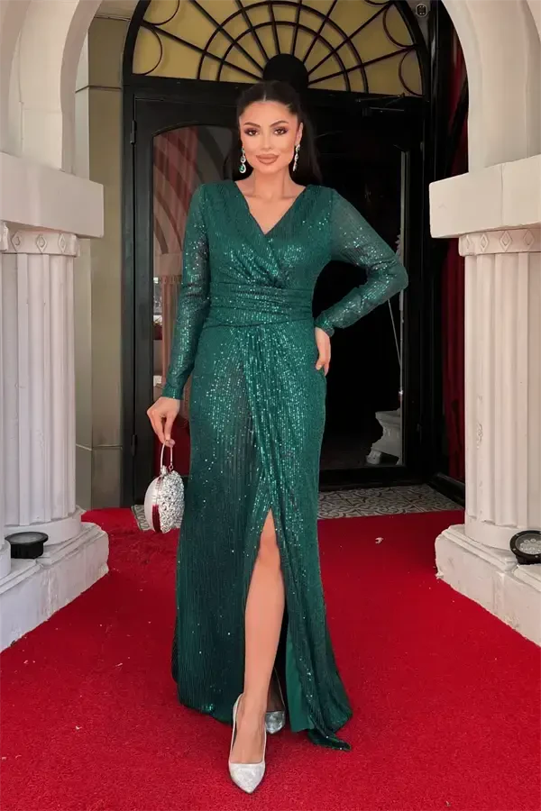 Платье вечернее изумрудно-зеленое с пайетками, запахом и V-образным вырезом | Стильный и элегантный дизайн