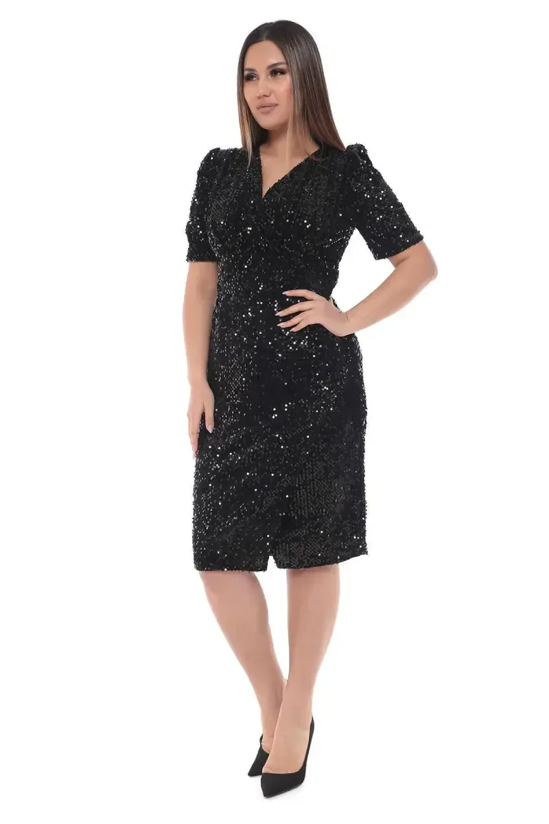 **Шикарное платье-смокинг большого размера с пайетками GLS6301 - черное**Платье-смокинг из бархата с пайетками станет идеальным выбором для особых случаев и вечеров. Сочетание благородства бархата и блеска пайеток создает завораживающий образ, который не оставит вас незамеченной.**Вневременная элегантность**Бархатная ткань платья отличается мягкостью и струящейся формой, что обеспечивает непревзойденный комфорт. Длина изделия составляет 115 см, что подходит для любого типа фигуры. Полностью подкладка скрывает недостатки фигуры и гарантирует безупречную посадку в течение всего дня.**Идеальная посадка на любую фигуру**На модели представлено платье размера S/36. Параметры модели: грудь: 85 см, бедра: 92 см, талия: 69 см. Платье доступно в широком диапазоне размеров, чтобы соответствовать различным типам телосложения.**Изысканные детали**Броские пайетки придают платью особый блеск, деликатно украшая линию декольте и рукава. Аксессуары, такие как украшения, пояса и другие, представленные на фотографиях, в комплект не входят, но вы можете дополнить свой образ любимыми деталями.**Для особых случаев**Платье-смокинг большого размера с пайетками идеально подойдет для свадеб, помолвок, торжественных мероприятий и балов. Его изысканный дизайн, непревзойденный комфорт и завораживающая красота сделают вас центром внимания в любом месте.