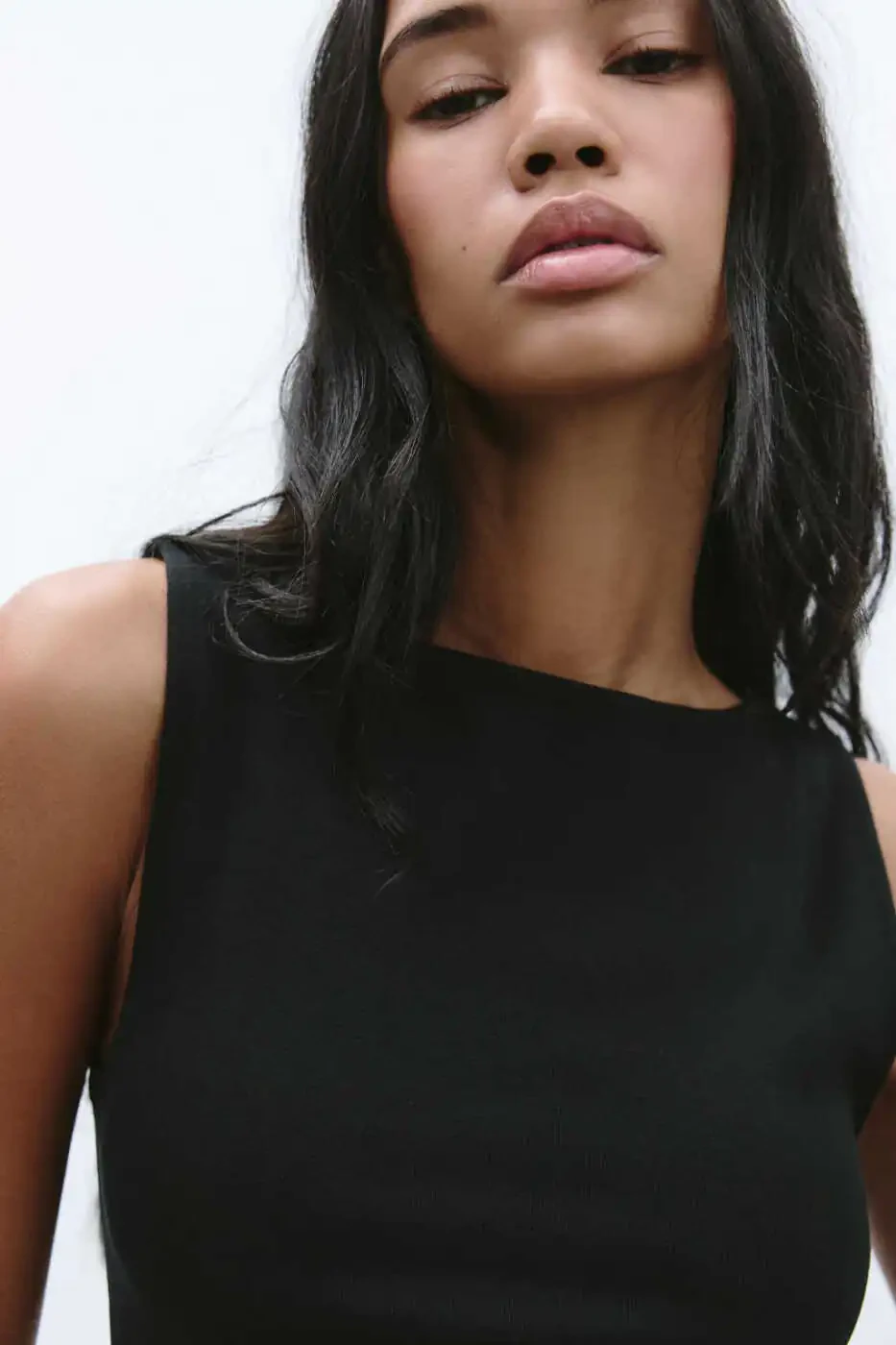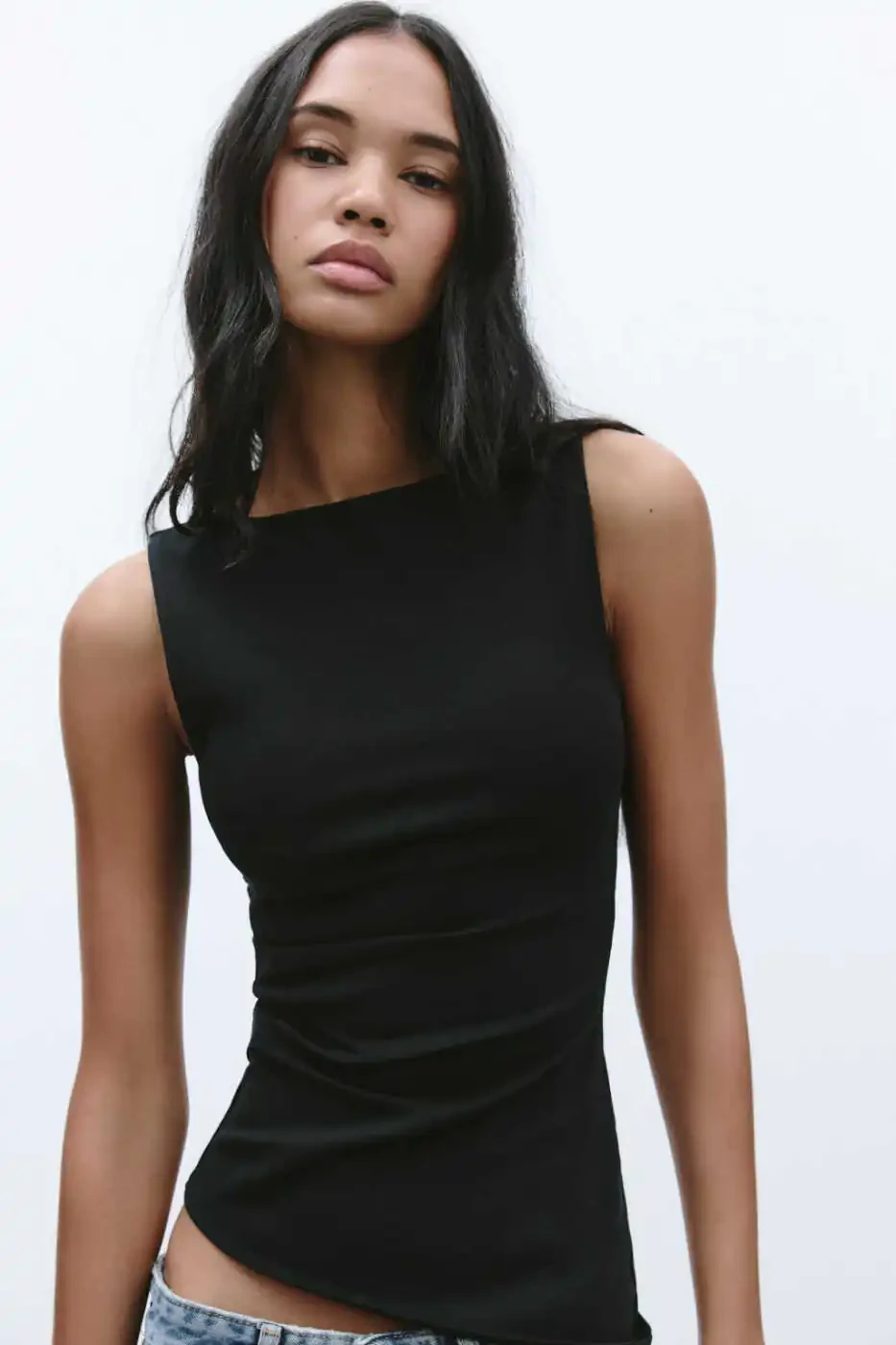 PLEATED ASYMMETRIC T-SHIRT - Black is a unique and stylish piece that will become a staple in your wardrobe. This t-shirt is designed for women who are looking for a modern and sophisticated look. The wide neckline creates an elegant neckline, while the sleeveless cut keeps you cool and comfortable in warm weather. The most striking feature of the t-shirt is the pleated details on the sides. These pleats add movement and dimension to the t-shirt while adding a feminine touch. The asymmetric cut creates a dynamic and modern silhouette away from the ordinary. Thanks to the nobility and versatility of black, you can combine this t-shirt in different styles. You can achieve a casual look for daily use with jeans and sneakers, or you can create a more sophisticated style by combining it with a stylish skirt and heels for a special event. You can also enrich the look of the t-shirt with your accessories. For example, you can complete your style with a large necklace or a stylish shawl. PLEATED ASYMMETRIC T-SHIRT - Black is not only stylish, but also offers comfortable use. Thanks to its high-quality fabric, you will feel comfortable all day long. The breathable structure of the fabric prevents sweating and allows your skin to breathe. The draped cut of the t-shirt allows you to move comfortably without constricting your body. This t-shirt is a versatile piece that can be worn in any season. You can wear it alone in summer, or combine it with a jacket or cardigan in spring and autumn. In winter, you can create a layered style by wearing it under a thick sweater. PLEATED ASYMMETRIC T-SHIRT - Black is a long-lasting and durable product. With proper care, it will remain in your wardrobe for many years. By following the washing instructions of the t-shirt, you can prevent the color from fading and the fabric from wearing out. This t-shirt is an ideal choice for both daily use and special occasions. Reflect your style with the PLEATED ASYMMETRIC T-SHIRT - Black, which offers style and comfort together, and attract attention in any environment.