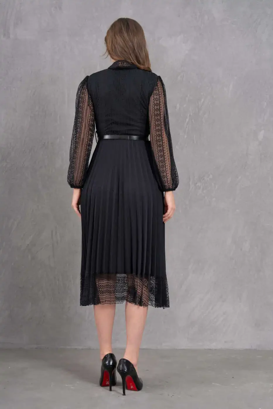 Pleated Detail Belted Design Long Sleeve Black Lace Dress offers a special design that combines elegance and grace. With the enchanting texture of lace, the dynamism of pleated details, and the figure-flattering effect of the belted design, this dress will ensure you dazzle at your special occasions and invitations. The long-sleeved design offers both a stylish look and keeps you warm in cool weather. The noble and timeless color of black can be easily combined with all kinds of accessories and shoes, allowing you to reflect your own style.Product DescriptionPleated Detail Belted Design Long Sleeve Black Lace Dress is a candidate to be an indispensable part of your wardrobe. The elegant texture of the lace creates a feminine silhouette, while the pleated details add movement and liveliness to the dress. The belted design emphasizes your waist, revealing your body lines and offering a more fit look. The long sleeves both complete the elegance and provide ideal use during seasonal transitions. The classic and sophisticated stance of black makes this dress a perfect choice for all kinds of special events. Whether you are attending a party or going out for a special dinner, you will always look stylish and elegant in this dress. The cut of the dress offers comfortable use without restricting your freedom of movement, while the quality lace fabric used promises long-lasting use. Offering a wide range of combination options, you can complete this dress with high heels and a stylish clutch for an unforgettable look. If you wish, you can also combine it with an elegant necklace and ballet flats for a more casual style. The Pleated Detail Belted Design Long Sleeve Black Lace Dress is not just a garment, but also a style statement. If you want to feel special and attract attention in every environment, this dress is for you. This special piece, which stands out with its design, will be one of the most valuable pieces of your wardrobe and will accompany you for many years. With the elegance of lace details, the dynamism of pleats, and the body-hugging structure of the belted design, this dress offers elegance and comfort together. Every detail of this dress has been carefully designed to accompany you on your special moments and help you create unforgettable memories.Product Features* Lace fabric* Pleated detail* Belted design* Long sleeve* Black color* Elegant and stylish look* Figure-flattering cut* Comfortable use* High-quality material* Different combination optionsAdditional InformationDry cleaning is recommended for the longevity of the dress. The fabric of the product may be sensitive, so it is recommended to iron it on low heat and inside out. Since the buckle of the belt has metal details, it should not be exposed to direct sunlight for a long time. The dress can be easily preferred for special days and invitations, and is also suitable for daily use when combined with the right accessories. The size on the model is 36 and the model is 1.75 cm tall.