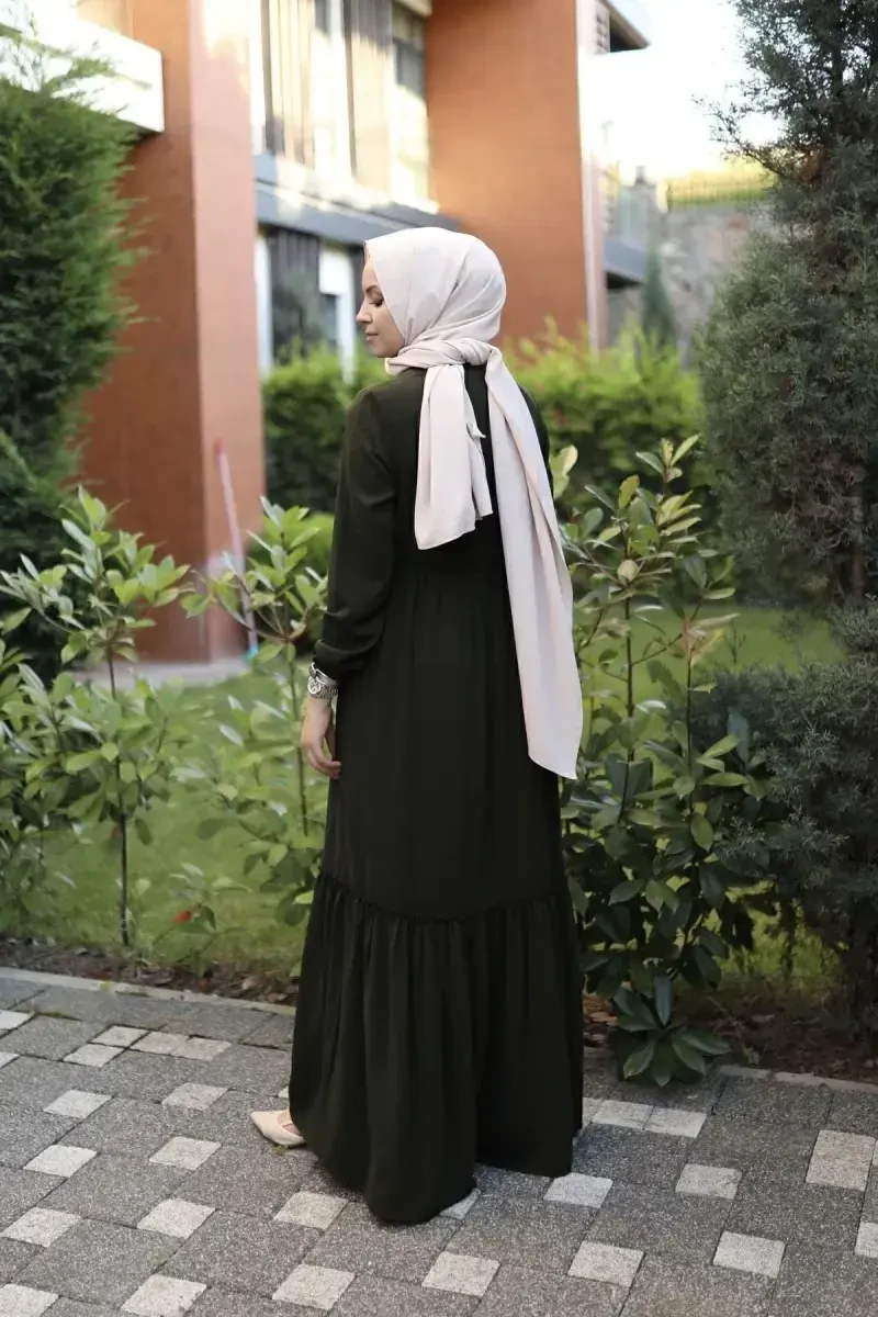 Gathered Abaya - Khaki is a special design that combines comfort and elegance. Ideal for daily use, this abaya attracts attention with its modern details and comfortable cut. Thanks to its high-quality fabric, it is long-lasting and easy to iron. Its khaki color is a candidate to be an indispensable part of your wardrobe by adapting to all kinds of combinations.Product DescriptionGathered Abaya - Khaki offers a modern and elegant look while prioritizing your comfort throughout the day. The abaya has a special design that combines elegance and comfort. Thanks to its high-quality, breathable fabric, it offers a cool wearing experience even in hot weather. The khaki color represents naturalness and simplicity, while allowing you to create different combinations. This abaya, which is a perfect option for daily use, is also a piece that will complete your elegance at special invitations. Ruffle details add movement and a modern touch to the abaya, while its loose fit allows you to move freely. It is an ideal choice for women who care about both comfort and elegance. The fabric of the abaya offers practical use thanks to its easy-to-iron feature. It saves you time on your busy days and ensures you always look well-groomed. Thanks to its draped structure, it gently covers body lines and adapts to every body. The abaya is a candidate to be one of the most loved pieces of your wardrobe. You can easily choose this abaya in business life, daily trips or special meetings, and it allows you to reflect your style. While highlighting your elegance and grace, it also ensures you do not compromise on your comfort. Gathered Abaya - Khaki is a perfect option for women who embrace both modern and traditional clothing styles. Thanks to its all-season wearability, it is an investment that will remain in your wardrobe for many years. The quality of its fabric and the care in its sewing details ensure that the abaya is long-lasting. If you want to bring a different breath to your style and attract attention in any environment, Gathered Abaya - Khaki is for you. Combining your elegance and comfort, this abaya will be an indispensable part of your wardrobe.Product Features* High quality, breathable fabric* Comfortable and loose fit* Modern gathering details* Easy to iron structure* Khaki color, suitable for different combinations* Suitable for daily use and special occasions* Gently covers body lines with its draped structure* Wearable in all seasons* Long-lasting and durable* Stylish and elegant designAdditional InformationIt is recommended to wash Gathered Abaya - Khaki according to the washing instructions on the label to ensure its long life. Avoid using bleach to protect the product's color and texture. You can iron at low heat to remove wrinkles. Dry cleaning can also be done. The fabric of the abaya offers comfortable use throughout the day thanks to its non-sweating structure. You can reflect your personal style by combining it with different accessories suitable for your style.
