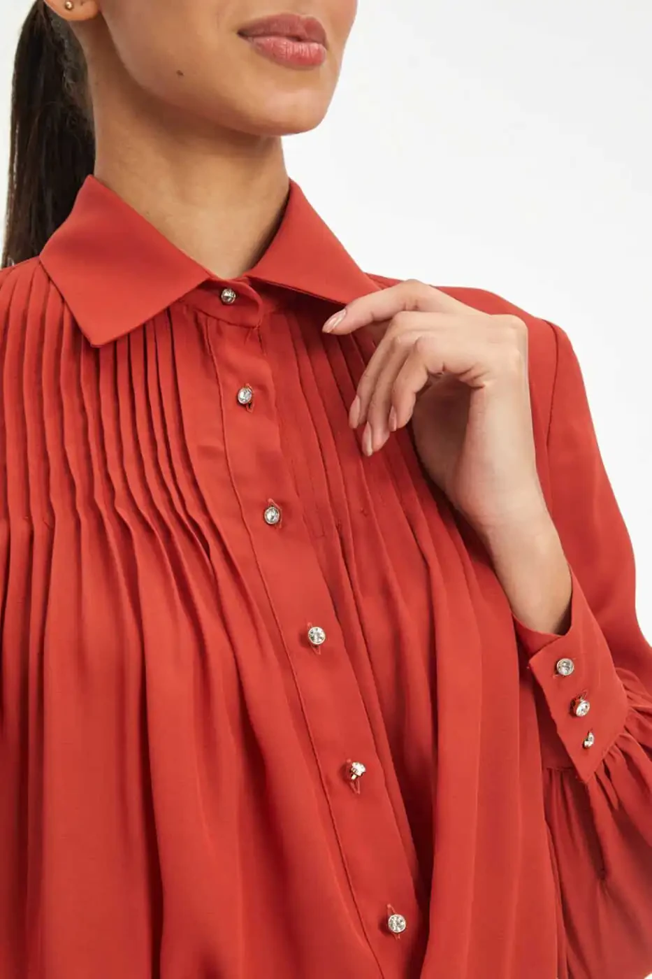 pleated shirt, long sleeve shirt, buttoned shirt, classic shirt, brick colored shirt