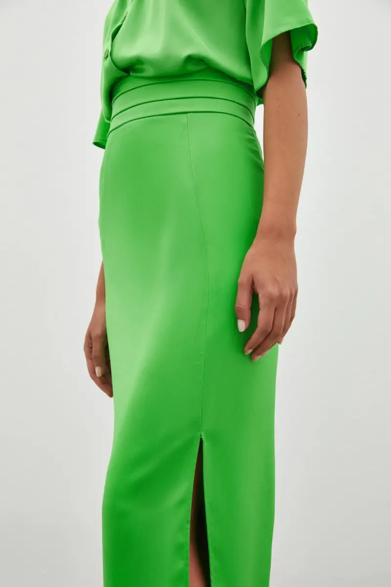The Belted Pleated Satin Skirt, a perfect choice for a graceful and stylish look, will add a touch of sophistication to all your outfits. Made from soft and flowing satin fabric, the skirt features elegant pleats that create a dynamic look. Its light green color will suit every skin tone, making it a chic option for both casual and special occasions.