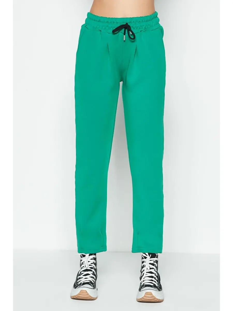 sweatpants, high waist, elasticated, pleated, cotton, seasonal, with pockets, green sweatpants, women's sweatpants, sportswear