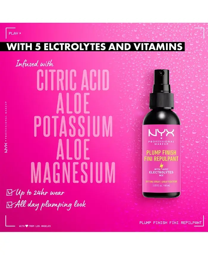 How to Use: Hold 15-20 cm away from your face and soak your skin with electrolytes and vitamins. Use after applying makeup or throughout the day. It is recommended to use with NYX Professional Makeup Plump Right Back Plumping Primer.