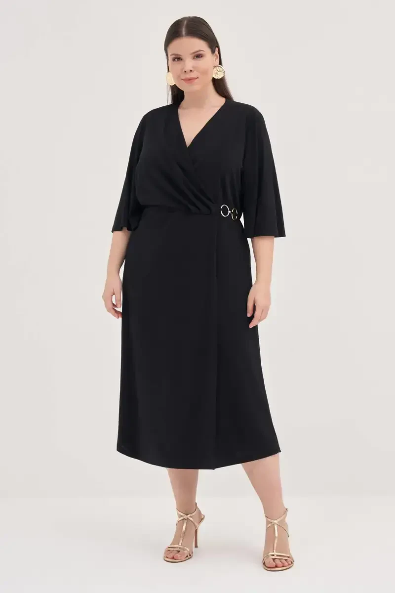 Highlight your elegance and grace with the Plus Size Black Wrap Dress with Ring Detail GLS45. This special design dress helps plus-size women enhance their self-confidence by perfectly accentuating their body lines. The wrap-over cut offers all-day comfort with its body-hugging yet freedom-of-movement design. Carrying the nobility of black, this dress can be easily preferred in any environment, from special invitations to daily use.One of the striking details of the dress is the ring detail, which adds an elegant touch to the décolleté area, while the boat neck design makes the shoulders look more elegant. Its midi length offers both a modern and classic look, adapting to all styles. The light and fluid structure of the crepe fabric makes the dress look like a dream on you. The quality of the fabric offers long-term use, while its easy-to-iron feature provides practicality.This dress, which puts an end to the difficulty of finding suitable clothes, which is one of the biggest problems of plus-size women, is ideal for women in the 44-46 size range. It is designed considering the measurements of the model (Height: 1.79 cm, Weight: 79kg, Size: 44-46, Chest: 99 cm, Waist: 85 cm, Hips: 117cm). In this way, you can easily imagine how the dress will look on you.You can complete your daily combinations with stylish sandals and minimal jewelry, or combine it with high heels and showy accessories for special occasions. This dress, which will accompany you in any case, will be one of the indispensable pieces of your wardrobe. Make a difference with the Plus Size Black Wrap Dress with Ring Detail GLS45 whenever you want to feel special and beautiful. Remember, elegance is hidden in the details and this dress offers you elegance in every detail.