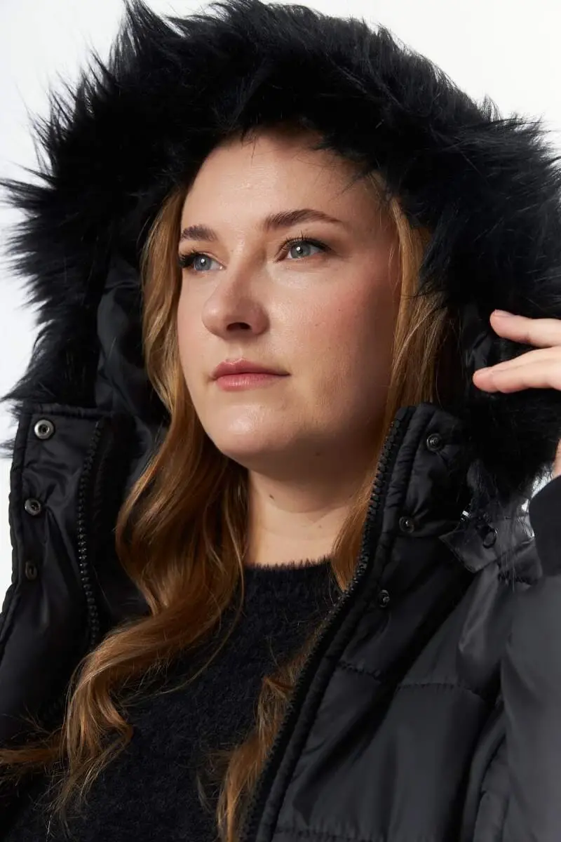 Brave the cold winter weather with the Plus Size Hooded Black Coat! This stylish and functional coat keeps you warm with its 100% polyester content, while its modern design complements your style. This coat, which pushes the boundaries of elegance in plus size clothing with its fit on the model, looks great on a model with a height of 1.74 m, a chest of 115 cm, a waist of 88 cm and a hip of 120 cm. Designed using a size 44 sample, the coat is 85 cm long and provides both comfortable movement and keeps your body warm thanks to its ideal length.Specially designed for the winter season, this coat prioritizes your comfort in cold weather. The hooded design protects your head in windy and rainy weather, while its modern cut ensures it matches any combination. Ideal for daily use, you can easily combine this coat with both sporty and classic outfits. The coat, which provides extra warmth thanks to its inner filling, also offers comfortable use all day long with its light structure.Finding the right pieces in plus size clothing can be difficult, but with this coat you can experience both elegance and comfort together. This coat, which will be an indispensable part of your wardrobe, will accompany you on cold winter days and will always make you look stylish. Thanks to its high-quality material structure, this coat offers long-lasting use and is an ideal choice to meet your winter clothing needs.Enjoy winter with the Plus Size Hooded Black Coat! Stay warm and don't compromise on your style. This coat offers the comfort and elegance you are looking for in plus size clothing and is a candidate to be the most loved piece of the winter season. Every detail of this coat is carefully designed, it will be one of the most valuable pieces of your wardrobe and will always make you feel good.