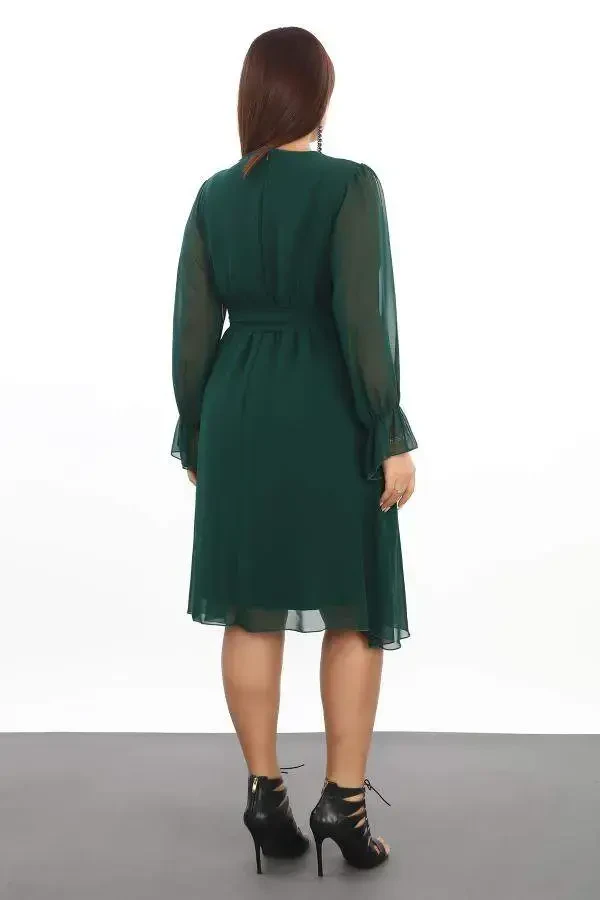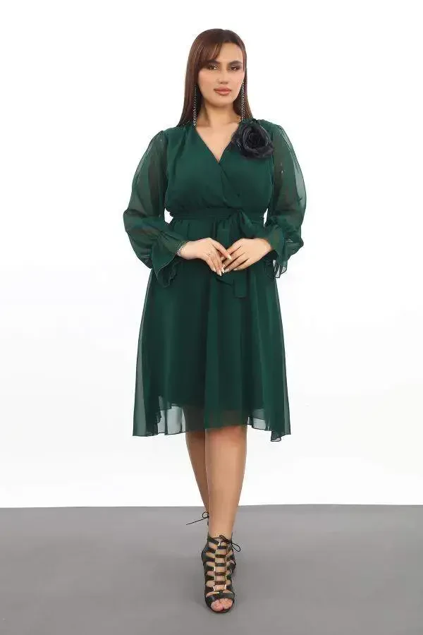 **Plus Size Comfortable and Flexible Short Green Chiffon Dress KL3086**This stunning green chiffon dress will make you shine on any special occasion. Its comfortable and flexible fabric will keep you at ease all day long.**Features:*** Model Measurements: * Height: 1.80 cm * Weight: 75 kg * Size: 44-46 * Bust: 106 cm * Waist: 87 cm * Hips: 113 cm* Dress Length: 110 cm* Fabric Type: Chiffon* Fabric Content: 100% Polyester* Pinned flower can be used optionally**Care Instructions:**Washing instructions are provided on the product's label.This short chiffon dress is a wardrobe essential with its elegance and comfort. Its comfortable fit design adapts to every body type and gracefully accentuates your curves.Get ready to dazzle in this dress for special occasions or everyday use!
