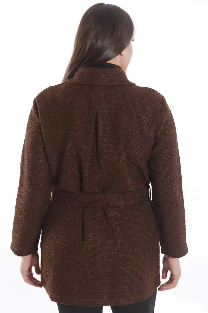 Redefine your style with the Plus Size Pocket Detailed Belted Button Closure Brown Jacket! This stylish and comfortable jacket is a perfect choice for both everyday wear and special occasions. Made from woven fabric, it provides all-day comfort thanks to its lightweight and soft texture. The jacket's comfortable form and straight cut fit your body perfectly, offering a stylish look. The brown tone easily adapts to all kinds of combinations, making it a candidate to be an indispensable part of your wardrobe.Pocket and belt details add a modern and elegant touch to the jacket, while the button closure provides ease of use. The hip-length allows it to be easily combined with both trousers and skirts. The men's collar detail adds a different touch to the jacket. Thanks to the belt detail, you can emphasize your waist and make your silhouette more defined. This jacket is in perfect harmony with your blouses, shirts, trousers and skirts, ensuring you always look stylish and well-groomed.Specially designed for women looking for plus sizes, this jacket offers comfort and elegance together. Thanks to its fabric blend of 40% Acrylic, 40% Cotton and 20% Polyester, it is both durable and comfortable. The jacket keeps you warm and prevents sweating with its breathable structure. This jacket, which will be one of the indispensable pieces of your wardrobe, is a versatile option that you can use in every season. Brown is one of the favorite tones of autumn and winter months and can be easily adapted to any style. This jacket, which prioritizes your elegance and comfort, will make you stand out in any environment. You can combine it with jeans and sneakers for a sporty look in daily use, and complete it with a stylish skirt and high heels for a special occasion. This jacket will be one of the most loved pieces of your wardrobe and will always give you confidence.