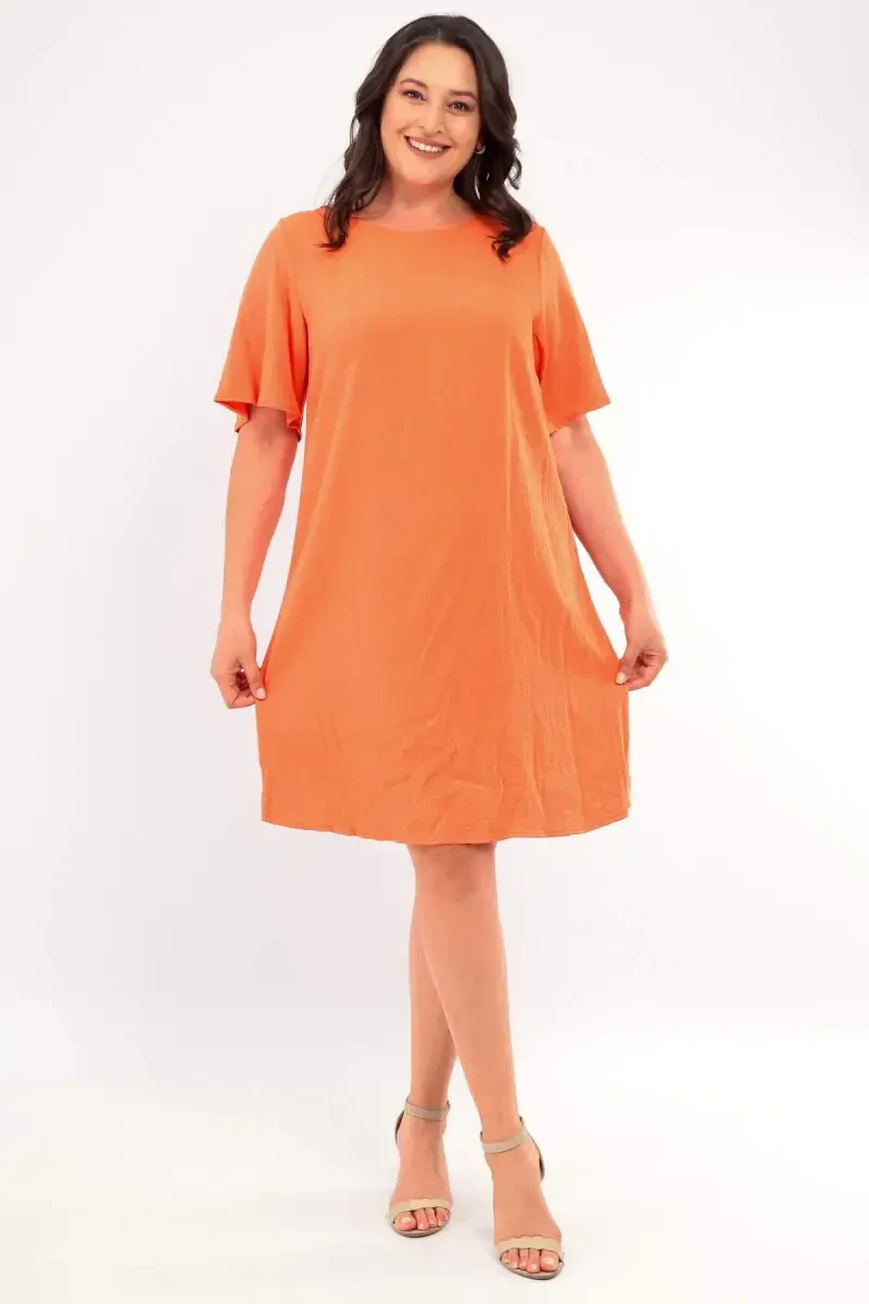 Specially designed for plus sizes, this short-sleeved orange dress offers you comfortable use thanks to its relaxed pattern and flexible fabric. The cycling collar and short sleeve design help you achieve both a stylish and comfortable look.With its special cotton blend texture that provides a cool use on summer days, our dress can be easily used both on special occasions and during work hours. Combining the power of simplicity with the appeal of details, this midi dress model is an ideal choice for those who want to create a strong and feminine effect.**Product Features*** Relaxed pattern* Flexible fabric* Cycling collar* Short sleeve* Orange color* 100% Polyester material**Measurements*** Model Measurements: * Shoulder: 47 cm * Chest: 97 cm * Hips: 105 cm * Waist: 80 cm * Height: 1.79 cm* Product Length: 126 cm* Model Size: 44