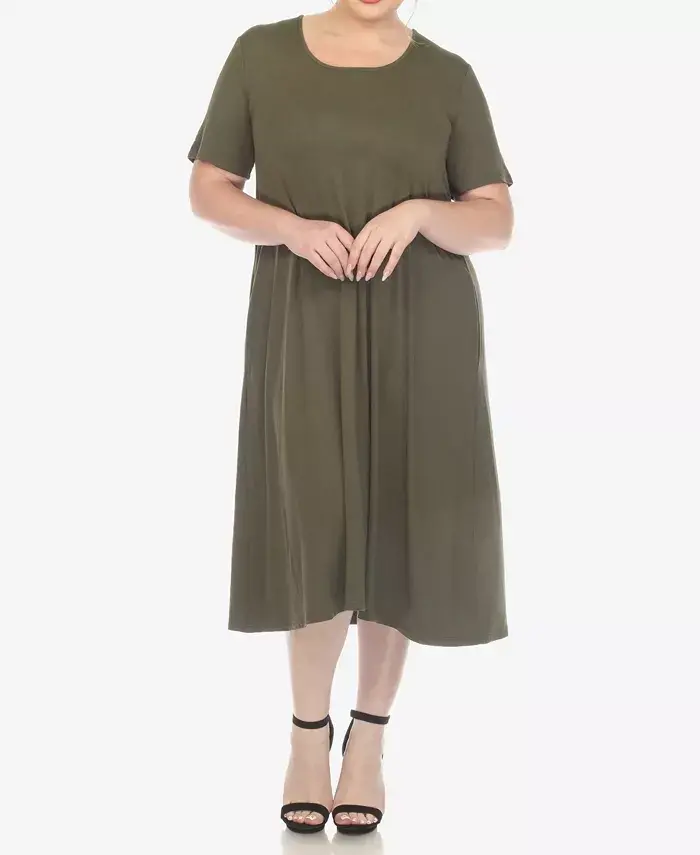 Plus Size Short Sleeve Pocket Swing Midi Dress - Olive