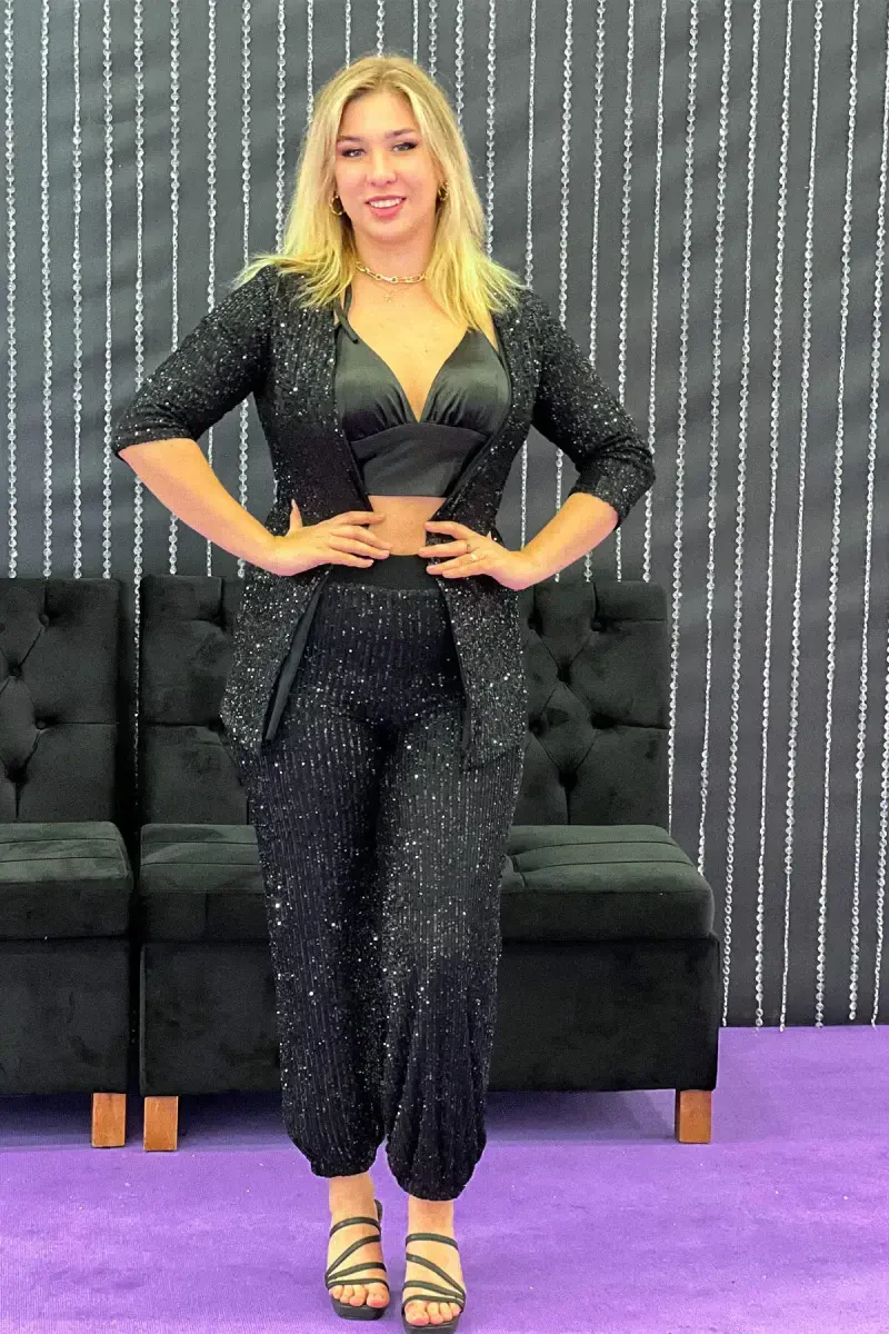 These stylish plus-size evening pants are sure to turn heads on special occasions. Featuring shimmering sequin beads and a flattering ankle-elastic design, these pants offer both comfort and glamour. Made from a breathable and stretchy fabric blend of 95% Polyester and 5% Lycra, these pants ensure a comfortable fit and freedom of movement. The 100 cm length provides a comfortable fit and allows for easy movement. With plus-size options available, they cater to all body types.