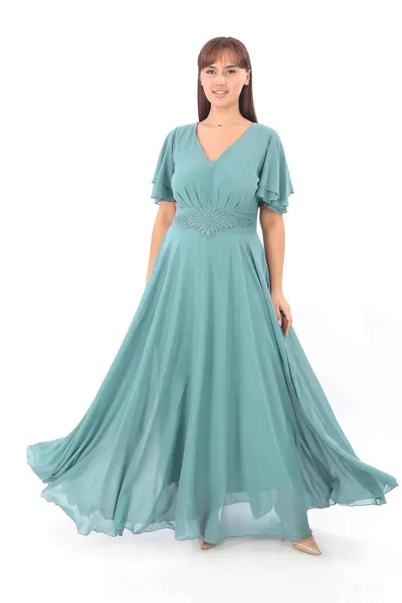 **Plus Size Women's Caped Sleeve Embroidered Flowy Calla Green Chiffon Formal Dress KL3045**
