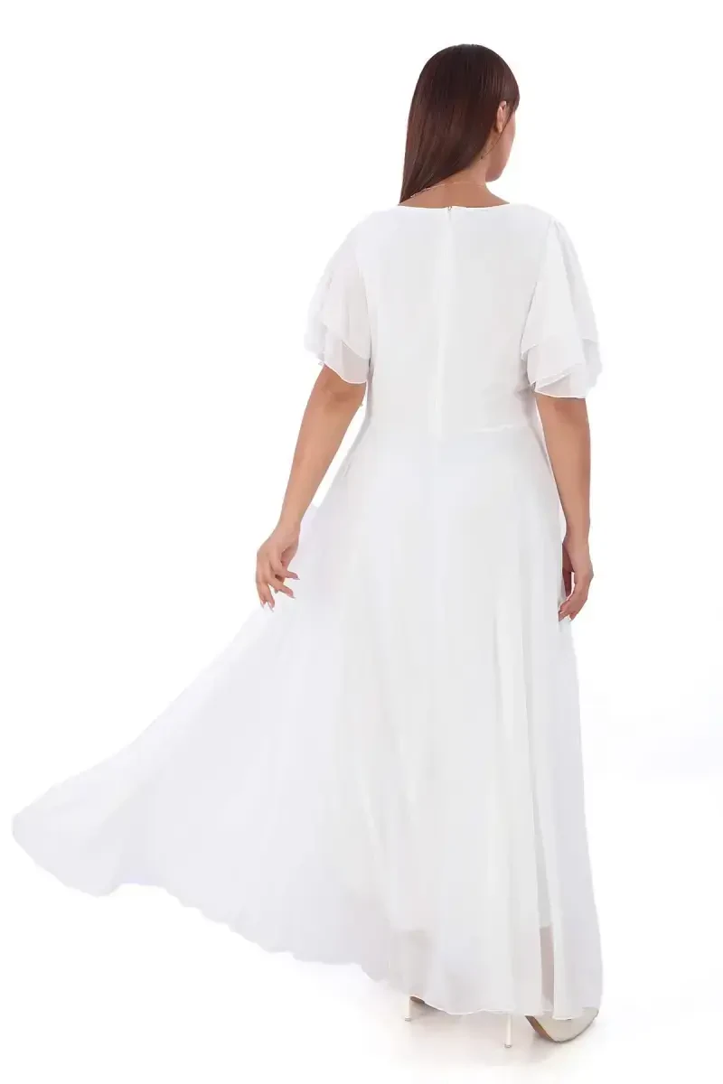 **Stunning White Chiffon Wedding Dress with Embellished Sleeves for Plus Size Women - KL3045**Designed to accentuate the beauty of plus size women, this exquisite wedding dress will make your dream wedding a reality. Its delicate chiffon fabric and flowing design drape beautifully over your body, creating a flattering silhouette.**Perfect Fit**Our model, who is 1.80 cm tall and weighs 82 kg, wears the dress in size 44-46. Her measurements are: 105 cm bust, 78 cm waist, and 115 cm hips. The dress, which is 150 cm long, will flatter women of all sizes.**Luxurious Chiffon Fabric**Crafted from a blend of 90% polyester and 10% lycra, the chiffon fabric is soft to the touch and drapes beautifully. Its lightweight and breathable nature will keep you comfortable throughout your special day.**Intricate Embellishments**The embellished sleeves add an extra touch of elegance to the dress. These delicate details will elevate your look with a touch of sophistication.**Easy Care**Washing instructions can be found on the dress's tags. With proper care, you can preserve this stunning dress for years to come.**Perfect for Any Body Type**Designed for plus size women, this wedding dress will make every woman feel beautiful and confident. Because beauty knows no size!