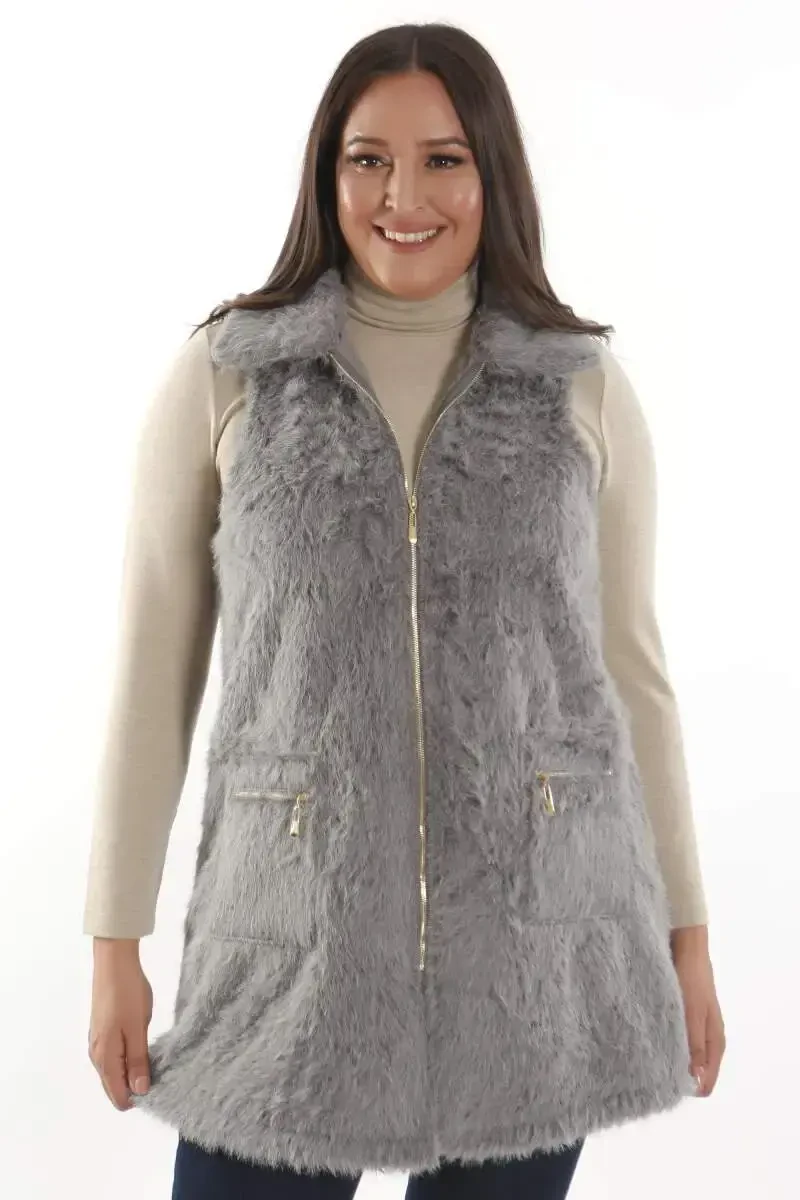 Plus Size Grey Fur Vest | Zippered, Stylish Model with Pockets