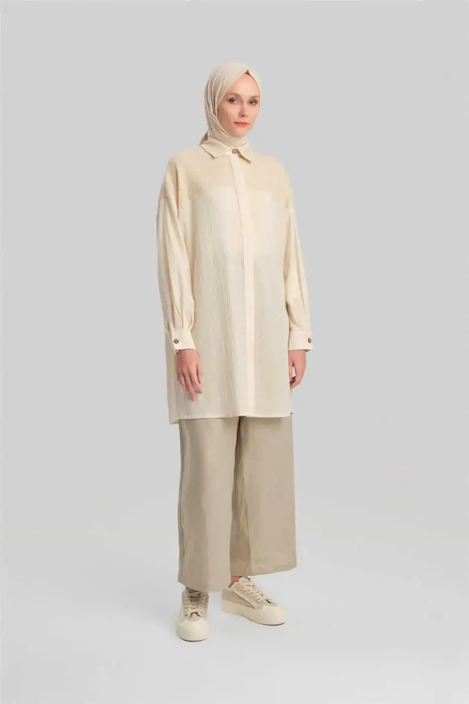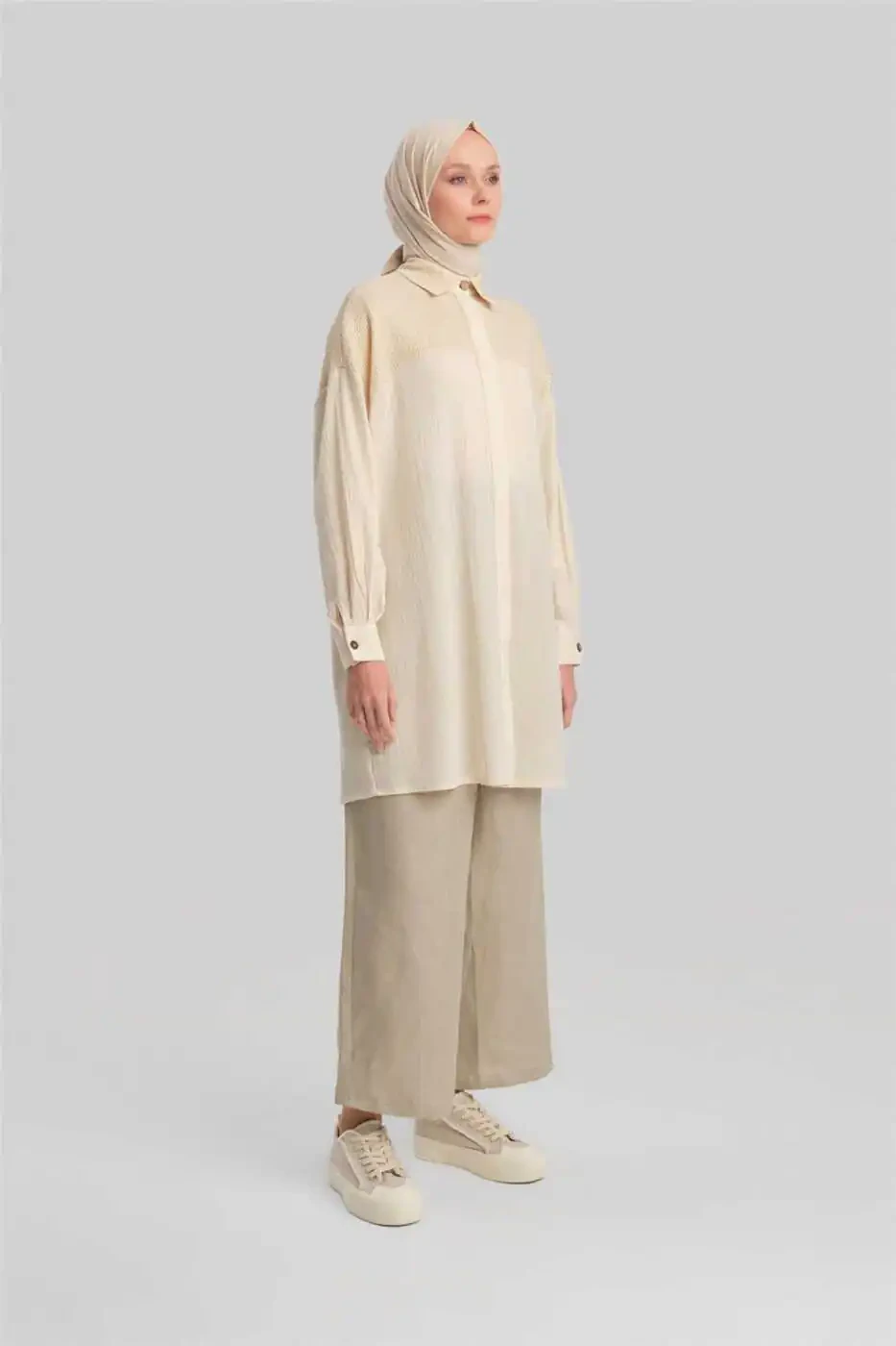 Yorqin va nafis ko'rinishga ega bo'lgan file detallari va zig'irsimon ko'rinishdagi tunikamiz bilan yoz mavsumida o'z uslubingizni aks ettiring.Yorqin matoning porlashi bilan zig'irsimon ko'rinishning tabiiy to'qimasini uyg'unlashtirib, ayni paytda zamonaviy va qulay tanlovni taklif etadi. File detallari zamonaviy va nafis uslub qo'shsa-da, tunik shakli harakat erkinligini ta'minlaydi. O'LCHAMLARI 38 40 42 44 KO'KRAKLAR 126 130 134 138 BEL 124 128 132 136 YELKA 25 25,5 26 26,5 YENG UZUNLIGI 48 48 48 48 BUYUMNING OLD TOMONI 92 92,5 93 93,5 BUYUMNING ORQA TOMONI 92 92,5 93 93,5 BUYUM O'LCHAMI: 38 MODEL O'LCHAMLARI BO'YI: 178sm KO'KRAGI: 83sm BELI: 62sm SONI: 91sm Mato tarkibi 100% Polyester