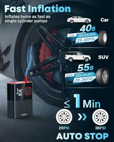 Непредвиденные ситуации, такие как внезапное спускание шины в условиях напряженного рабочего графика или длительного путешествия, могут быть очень неприятными. С портативным компрессором Kohree вы забудете об этих заботах! Его двухцилиндровый двигатель, работающий в 4 раза быстрее, мощный аккумулятор на 20000 мАч и интеллектуальные функции позволяют быстро и безопасно накачивать шины вашего автомобиля, пикапа или даже крупногабаритной техники. Благодаря компактной конструкции его легко носить с собой, хранить в автомобиле, рюкзаке или крепить к велосипеду. Простой интерфейс делает его удобным для всех пользователей. Просто нажмите кнопку питания и начните накачивание! Встроенные светодиоды обеспечивают безопасность даже в темноте. Несколько вариантов питания (аккумулятор 20000 мАч или автомобильный прикуриватель) и функция power bank позволяют заряжать ваш телефон и другие устройства. Kohree предлагает надежное решение даже в чрезвычайных ситуациях. Функция автоматического отключения при достижении заданного давления обеспечивает безопасность и практичность. Предлагает 5 режимов накачивания: для автомобиля, мотоцикла, велосипеда, мяча и пользовательский режим. 4 варианта единиц измерения давления: PSI, KPA, BAR и KG/CM позволяют выбрать наиболее подходящую для ваших нужд. Двойной шланг и организованное место для хранения предотвращают беспорядок и обеспечивают удобство использования. С Kohree ваши поездки станут безопаснее и комфортнее!
