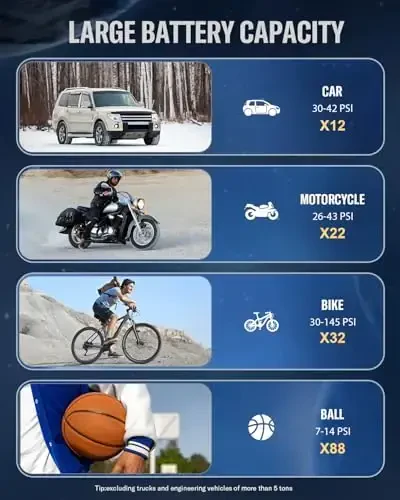 Портативный компрессор Tire Inflator Portable Air Compressor, разработанный для вашей безопасности и комфорта на дорогах, представляет собой быстрое и надежное решение для накачивания различных транспортных средств и оборудования, от автомобилей до велосипедов, с помощью насоса 160PSI. Это многофункциональное устройство, отражающее последние технологии 2024 года, позволяет сэкономить ваше время благодаря функции накачивания в 5 раз быстрее. Может накачать автомобильную шину размером 195/65/R15 от 0 psi до 35 psi менее чем за 3 минуты. Благодаря высокоточному измерению давления (±1%) гарантируется, что ваши шины всегда будут иметь идеальное давление. Простота в использовании обеспечивается 4 предустановленными режимами (велосипед, мотоцикл, автомобиль и мяч), а регулируемое значение давления до 160PSI обеспечивает гибкость для различных надувных изделий. Более того, это не просто автомобильный компрессор; встроенная функция power bank позволяет заряжать ваши мобильные устройства, а мощный светодиодный фонарь 400 люмен обеспечивает безопасную работу в темноте. Компактный и портативный дизайн позволяет легко носить его в автомобиле, на велосипеде или в рюкзаке. Мы предоставляем 2 года гарантии качества продукта и технической поддержки для долговечной работы. В комплект поставки входят: устройство для накачивания шин, различные насадки, зарядный кабель, руководство по эксплуатации и чехол для хранения. Закажите прямо сейчас и наслаждайтесь безопасной и комфортной поездкой в ваших путешествиях!