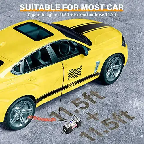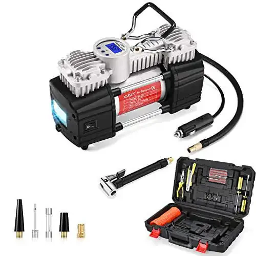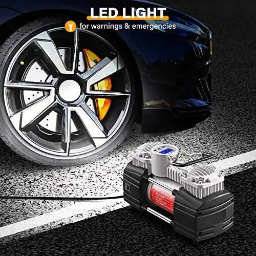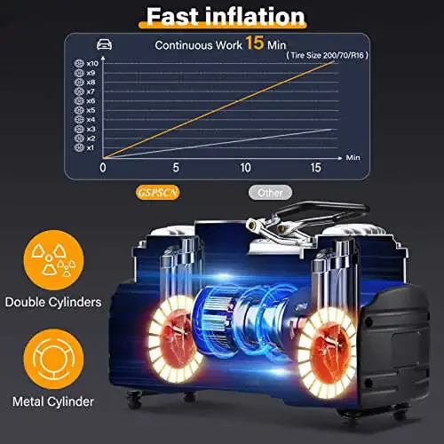 Надоело сталкиваться с проблемами давления в шинах в дороге? Встречайте портативный воздушный компрессор GSPSCN с цифровым манометром, сверхмощным двойным цилиндром и давлением 150 PSI - идеальный спутник для ваших автомобилей. Этот 12-вольтовый насос для накачки шин поставляется с ремкомплектом для шин и набором инструментов, что делает его идеальным для автомобилей, внедорожников, грузовиков, велосипедов и многого другого. Воздушный компрессор GSPSCN накачивает в 4 раза быстрее конкурентов благодаря своей двухцилиндровой конструкции, обеспечивая накачку за 1,5 минуты или меньше, экономя ваше время. Скорость потока 70 л/мин позволяет быстро и эффективно накачивать шины. Встроенный цифровой ЖК-манометр обеспечивает точные показания давления в четырех различных единицах измерения: PSI, KPA, BAR и KG/CM². Благодаря подсветке дисплей легко читается даже в темноте. Функция предварительной настройки отключения по давлению предотвращает перекачивание и гарантирует, что ваши шины всегда будут иметь правильное давление. Компактная и портативная конструкция позволяет легко хранить и перевозить его в вашем автомобиле. Ремкомплект для шин включает в себя все необходимые инструменты для устранения проколов шин, такие как плоскогубцы, нож, отвертка, лента для ремонта шин, игла и напильник. Этот компрессор, поставляемый с тремя различными адаптерами для сопел, можно использовать для различных типов шин и надувных изделий, таких как надувные матрасы, велосипеды, игрушки и многое другое. Портативный воздушный компрессор GSPSCN разработан для обеспечения вашей безопасности и комфорта в дороге. Благодаря прочной конструкции и высокой производительности это продукт, которым вы можете с уверенностью пользоваться долгие годы. Если вы ищете надежного спутника в путешествиях, портативный воздушный компрессор GSPSCN - идеальный выбор.