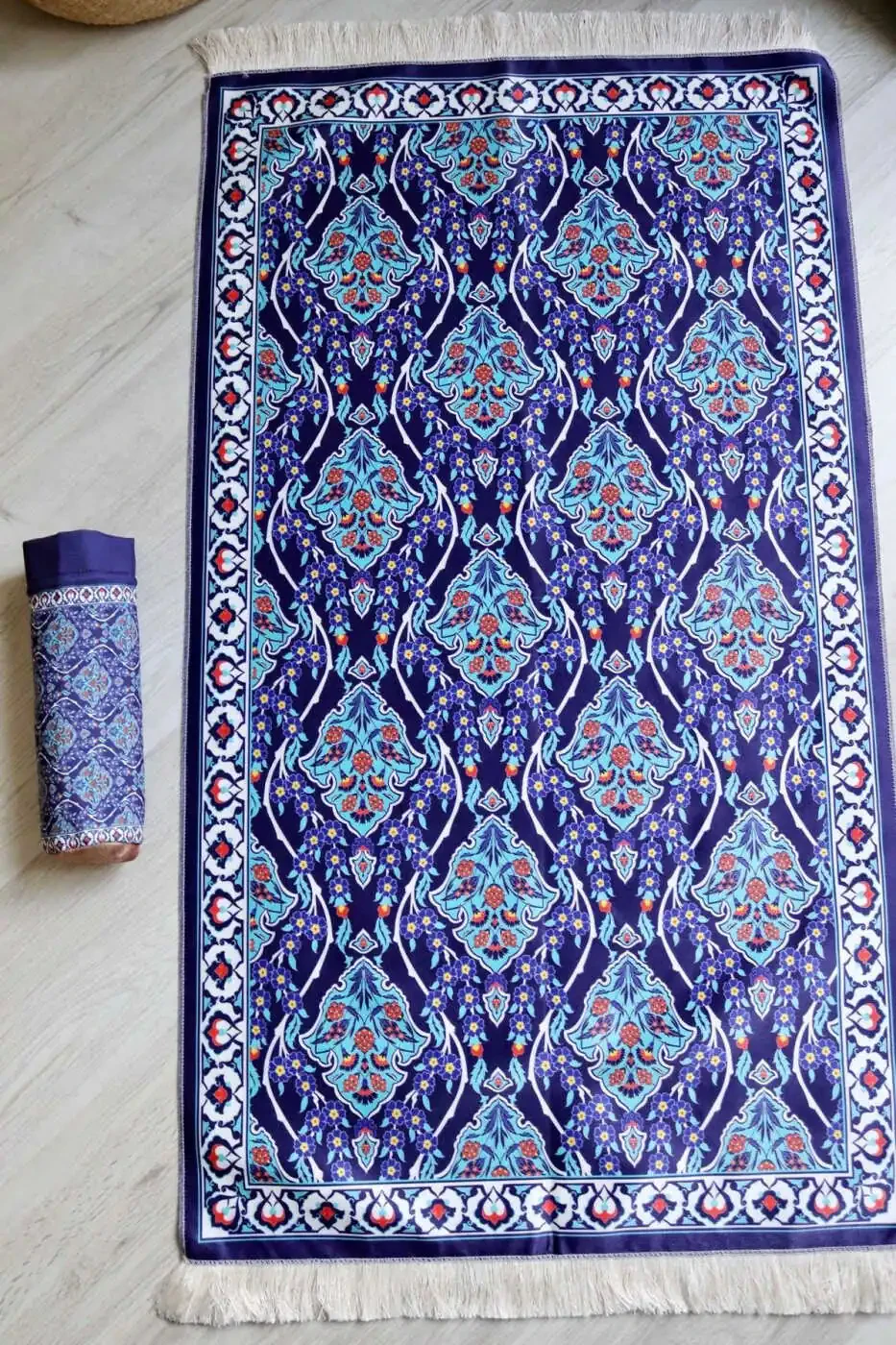 With its silky texture and captivating colors, our prayer rug offers a stylish look while being conveniently portable thanks to its compact design and lightweight structure.