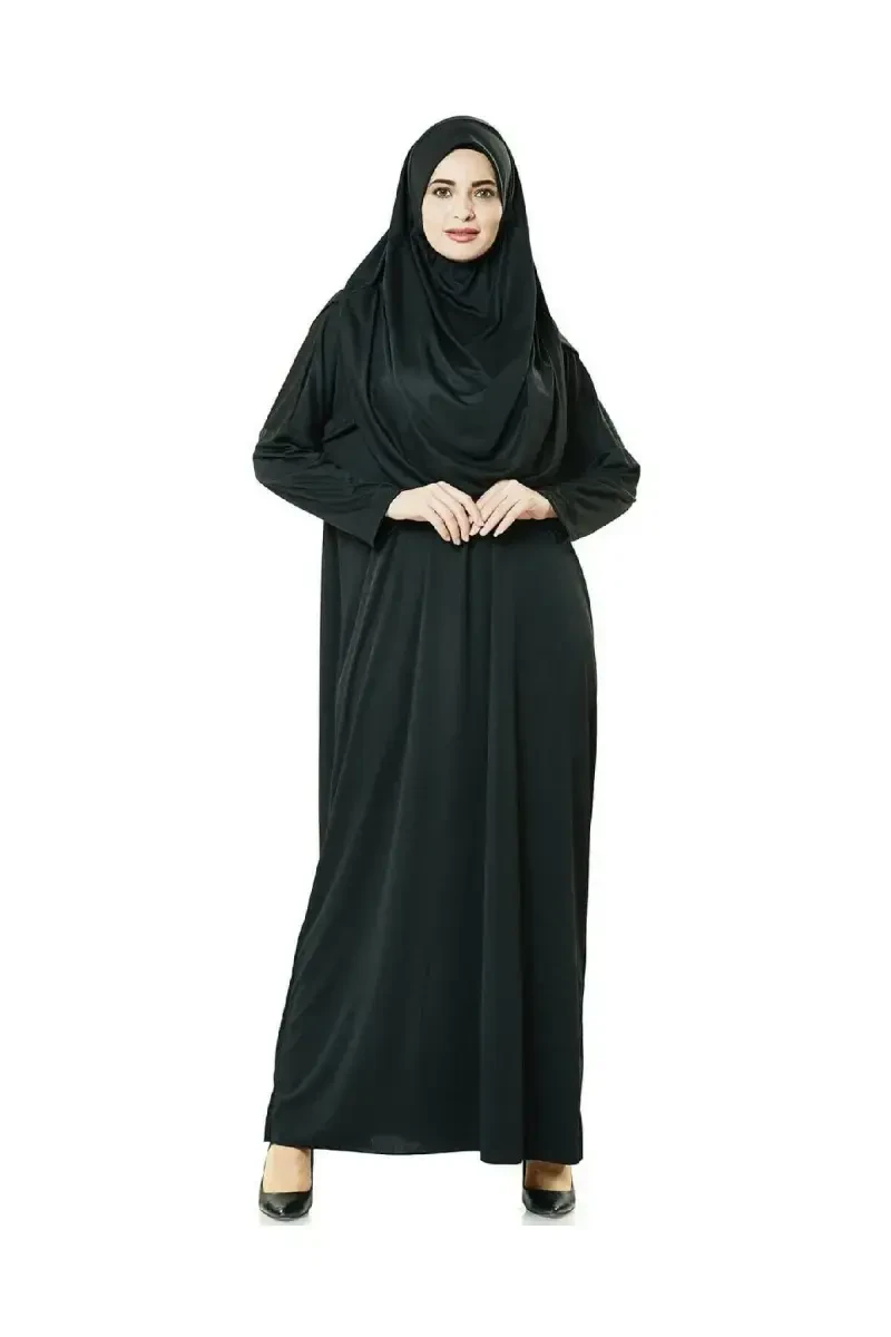 **Convenient Hijab-Attached One-Piece Prayer Dress and Prayer Rug Set (Black)****Product Features:*** **Effortless Wear and Removal:** The one-piece design allows you to put on and take off with ease.* **Lightweight and Breathable:** Crafted from soft and breathable fabric, ensuring utmost comfort during prayers.* **Hijab-Attached Model:** The built-in hijab provides a modest appearance during prayer, covering your hair effortlessly.* **Spacious Pocket:** Thoughtfully designed with a roomy pocket to store your Holy Quran, prayer beads, or other prayer essentials.* **Portable Prayer Rug:** A foldable prayer rug is included, making it perfect for traveling or outdoor prayers.* **Stunning Black Color:** The elegant black color complements any environment, offering a timeless look.**Benefits:*** Streamlines your prayer routine, making it more convenient and comfortable.* Provides a modest prayer experience without the hassle of arranging a separate hijab.* Keeps your belongings organized and within easy reach.* Offers practicality for travels or outdoor prayers.* Its stylish and sophisticated design makes you feel confident and composed.**Package Contents:*** One-Piece Prayer Dress* Foldable Prayer Rug