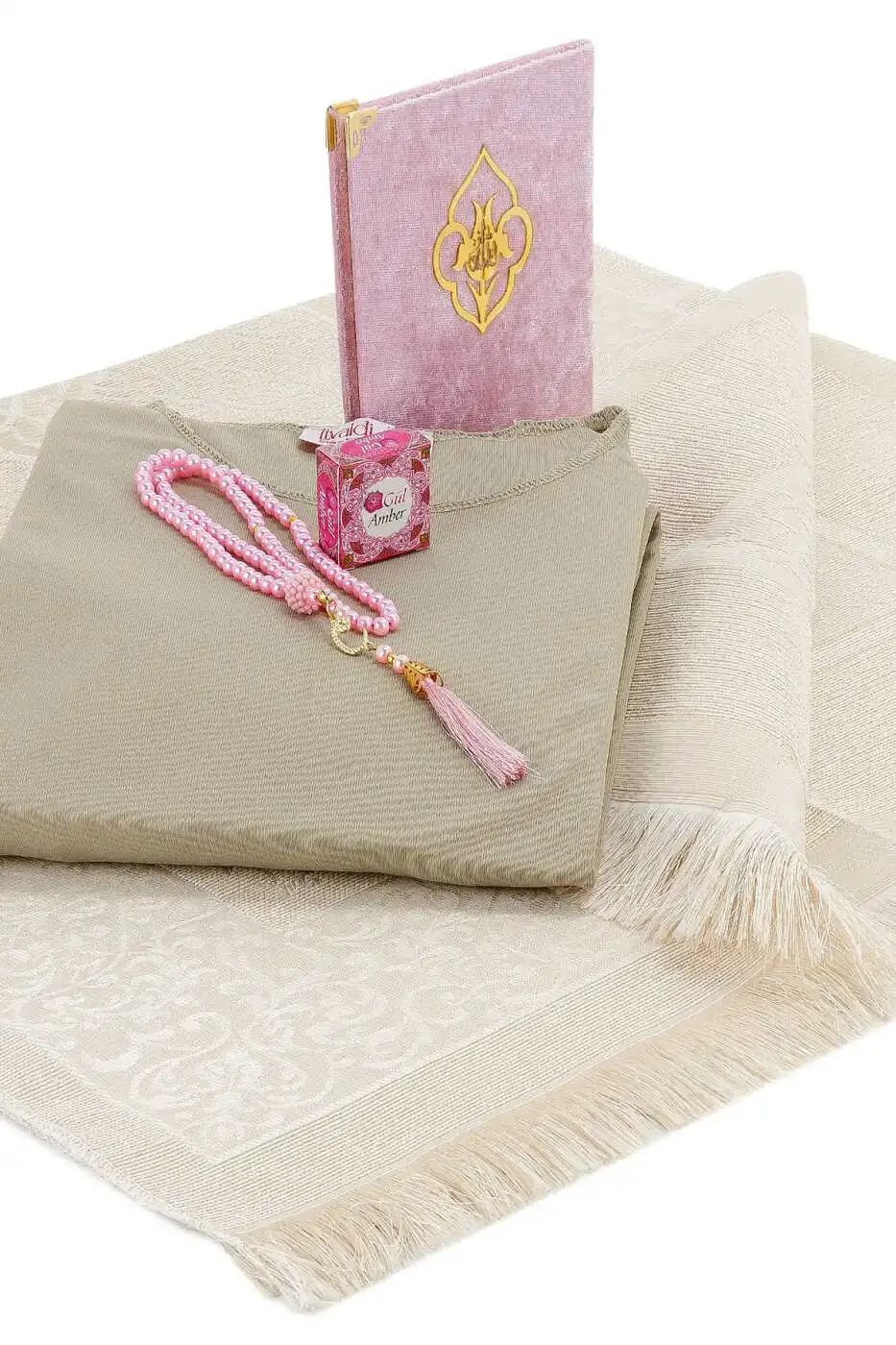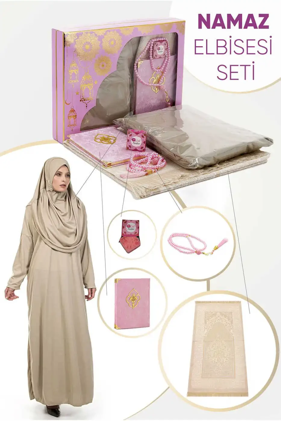 Ощутите спокойствие, комфорт и стиль во время молитв с помощью практичного односекционного молитвенного наряда с платком и молитвенного коврика в розовом цвете.