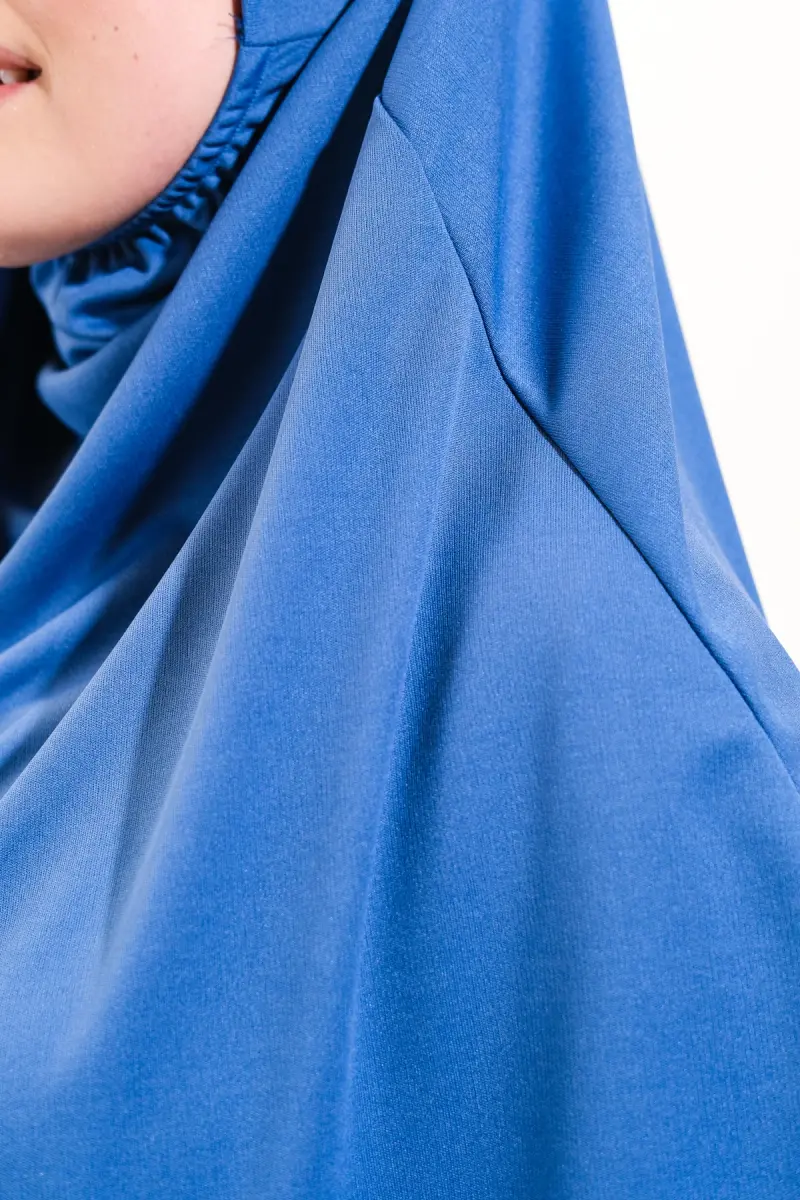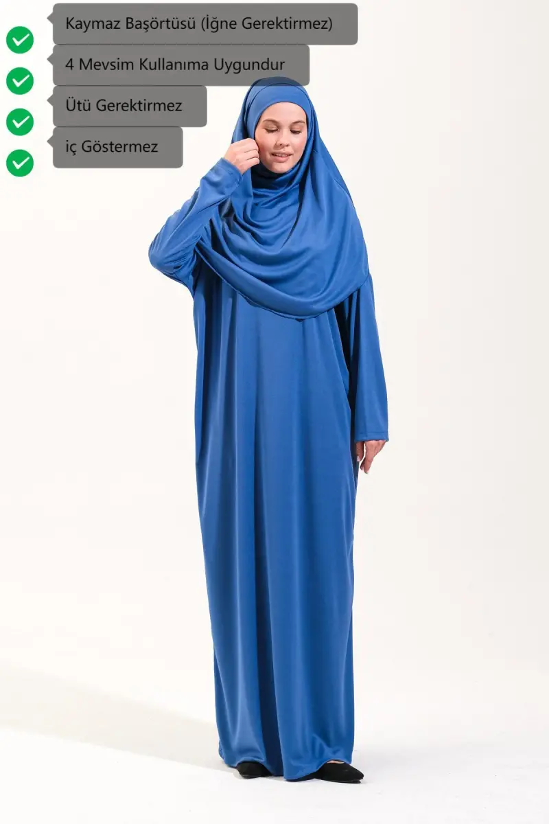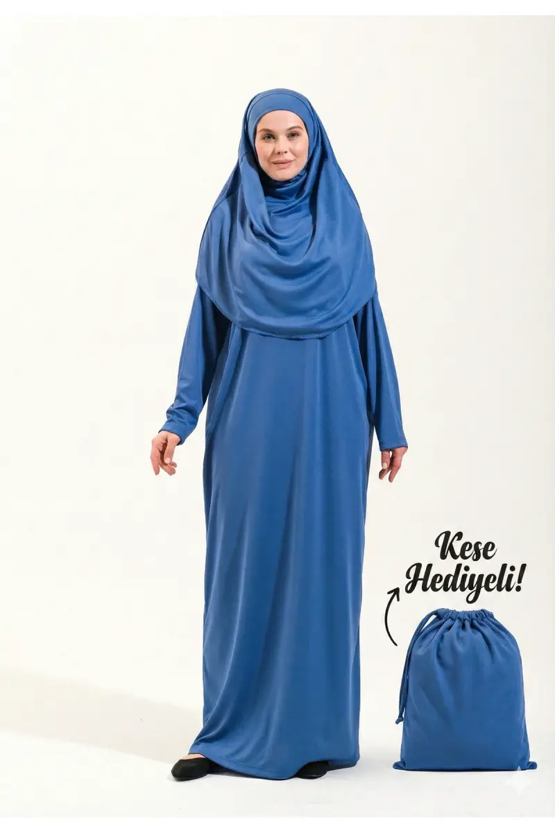 Pratik Tek Parça Kaymaz Başörtülü Kolay Giyilebilen Namaz Elbisesi-Çantalı Esnek Kumaş -Mavi-00404 Mavi