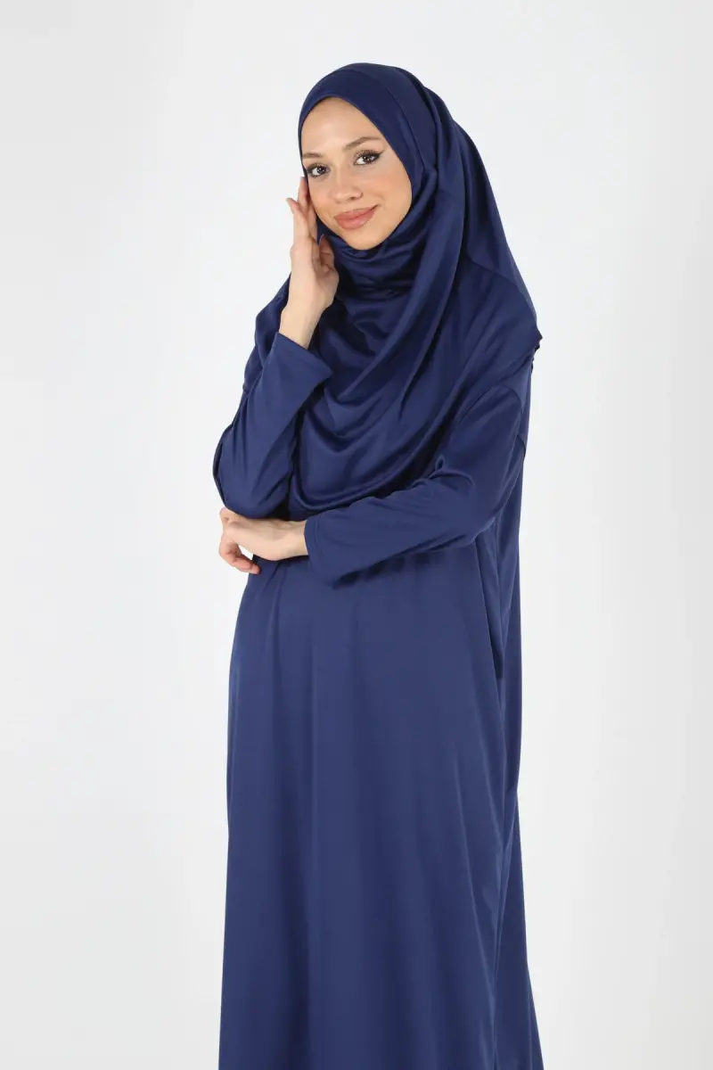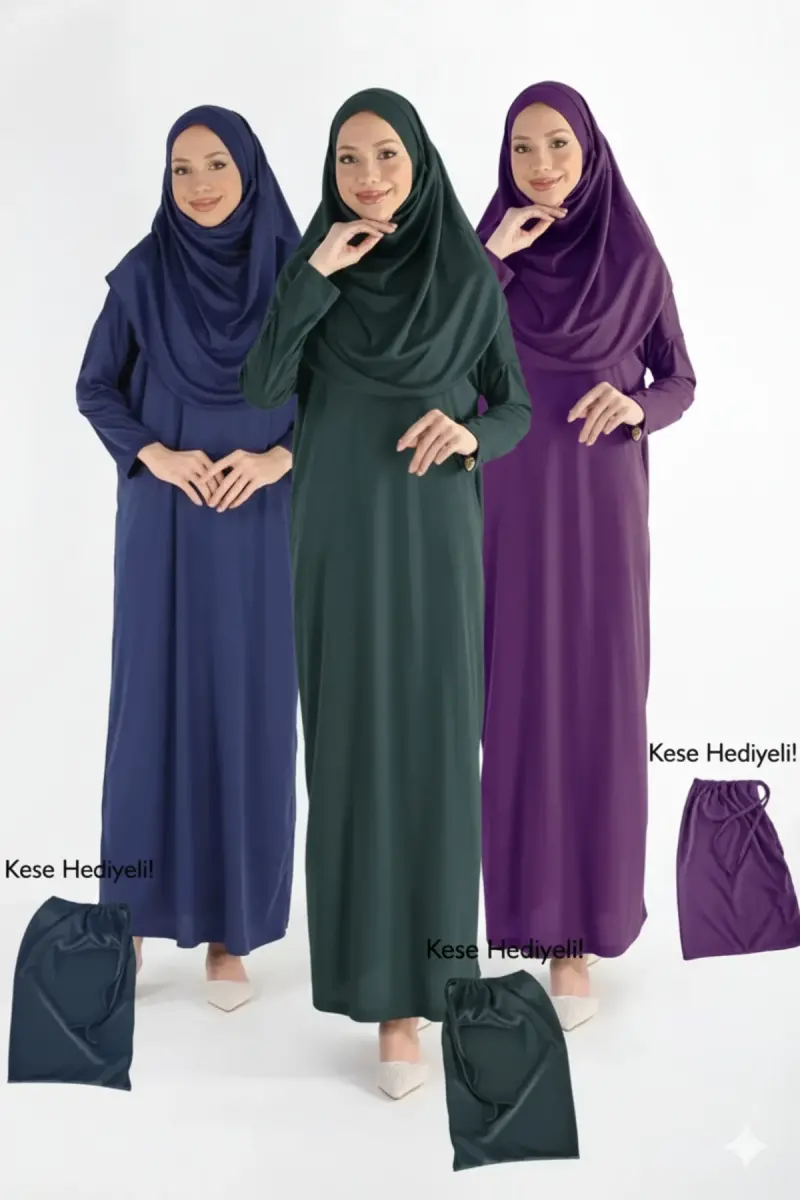 Pratik Tek Parça Kaymaz Başörtülü Kolay Giyilen Namaz Elbisesi-Çantalı - Lacivert Yeşil Mor-00559 Laci