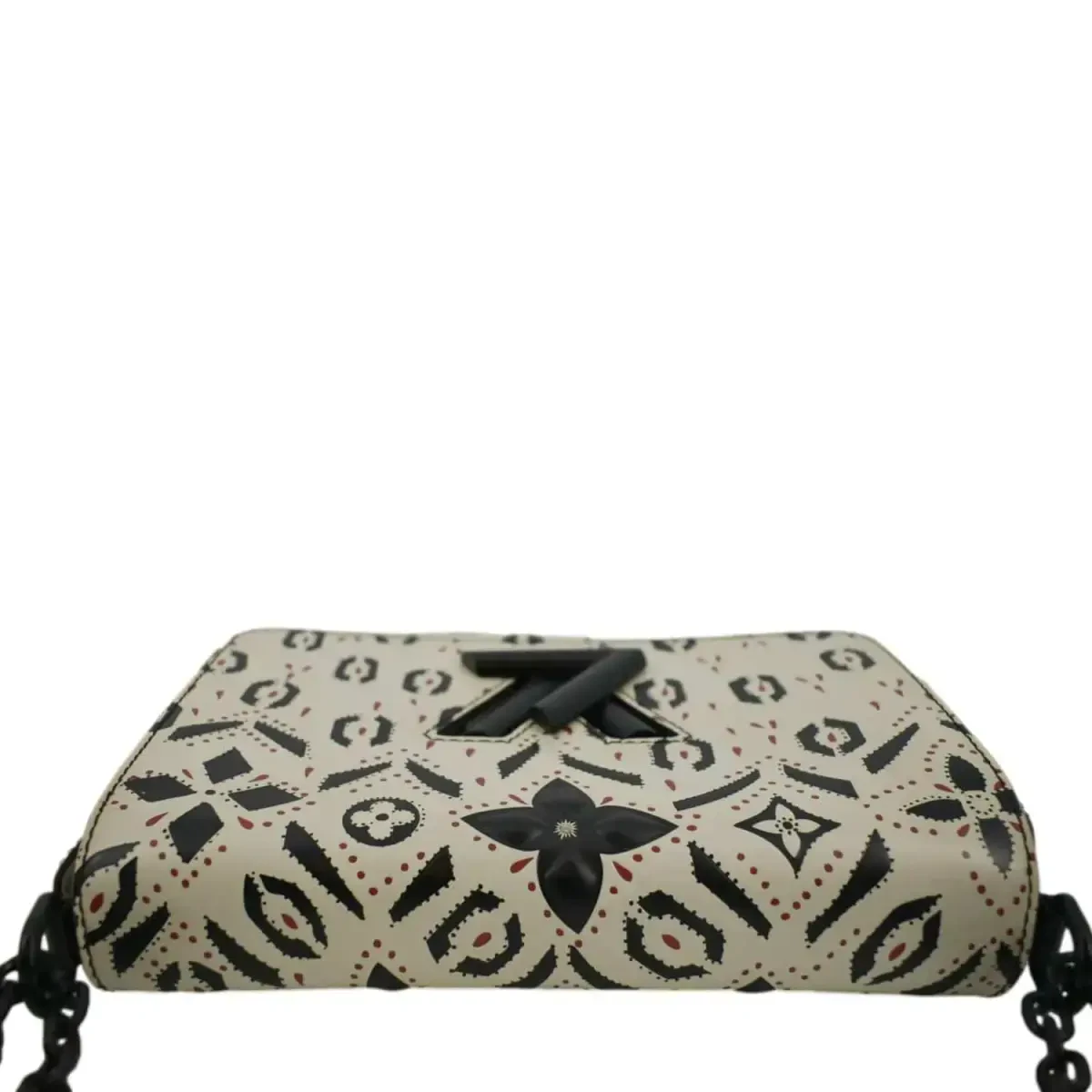 This pre-owned LOUIS VUITTON LV Twist Graphic MM Shoulder Bag is crafted from luxurious black leather. The bag features the iconic Twist lock, an adjustable and removable chain strap, and a roomy interior. The LV Twist Graphic print adds a modern touch to the bag's sophisticated look.