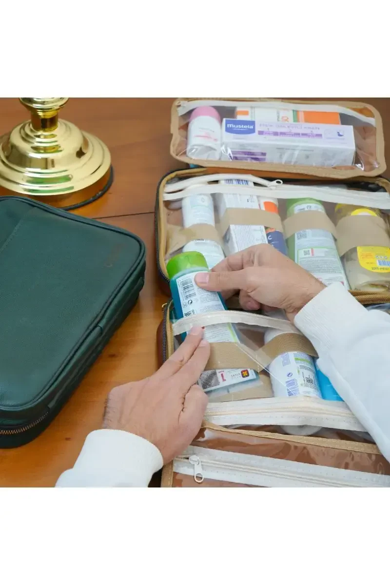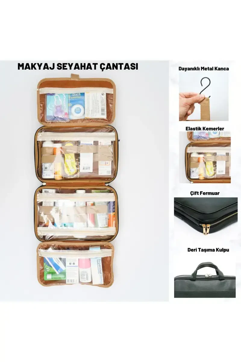 The Premium Makeup Travel Bag is a stylish and practical solution designed to help you organize your cosmetics, personal care items, and personal belongings during your travels and daily use. This specially designed suitcase organizer bag is offered with LifeZon assurance and is an indispensable companion for your travels. Thanks to its high-quality material, cleverly designed compartments, and practical usage features, you can neatly store everything from your makeup materials to your personal care products and easily access them.This travel makeup bag makes your life easier not only during your travels but also by providing organization in your bathroom or wardrobe at home. With its stylish design and useful structure, it is an ideal option for both women and men. The artificial leather exterior and velvet inner lining give the bag a luxurious look while also increasing its durability.One of the most important features of the bag is its numerous compartments and elastic bands. This allows you to place and secure your items of different sizes separately. Elastic bands prevent your items from moving inside the bag, minimizing the risk of breakage or spillage. The double-zippered compartment allows you to easily place larger items.Transparent compartments allow you to easily see the items inside, so you don't have to rummage through the entire bag to find what you're looking for. Thanks to the hook fixed to the upper compartment, you can hang the bag wherever you want and access all your belongings at the same time. This feature will be especially useful in hotel rooms or gyms.Thanks to its compact dimensions, it does not take up much space in your suitcase or backpack. This stylish bag, which you can carry with you in your daily use, is a practical solution that will make your life easier. This premium travel bag, which attracts attention with its green color, is both a functional and aesthetic product.Provide order in your travels and daily life with the Premium Makeup Travel Bag, safely carry your belongings, and always look stylish. This bag is not just a means of carrying items, but also an accessory that adds value to your life.