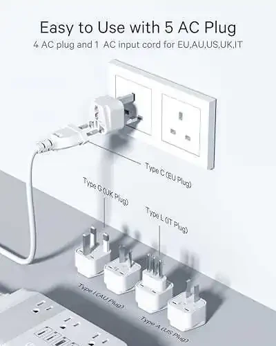 - Совместим с универсальными адаптерами питания, используемыми в более чем 200 странах, включая ЕС, Великобританию, Австралию и Италию.