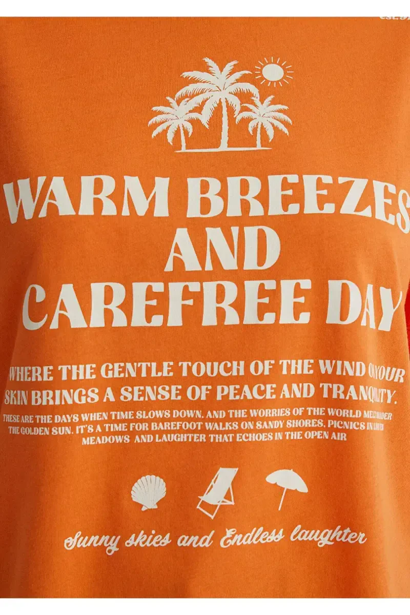 Bring the energy of summer to your wardrobe with the Printed Orange T-Shirt! This vibrant and stylish t-shirt is brought to you with the assurance of Mavi. This t-shirt, which will add a fresh touch to your daily style, offers both comfort and unique design together. You will attract attention with the warmth of the orange color and the fun print on it. Whether you spend a day in the city or enjoy the sun on vacation, this t-shirt will accompany you in any environment.This special design t-shirt stands out not only with its appearance but also with its quality. Thanks to its high-quality cotton fabric, it offers comfortable use all day long. It allows your skin to breathe and prevents sweating. You will feel like you are not wearing anything with its lightweight structure. Its crew neck and short sleeve design will be indispensable for summer months. The palm trees and sun motif on the front reflect the joy and energy of summer.The loose fit feature does not restrict your freedom of movement and provides comfortable use throughout the day. This t-shirt is an ideal choice for those who want to not only look stylish but also feel comfortable. The vibrant orange color will add energy to any combination and highlight your style. You can easily combine it with your jeans, shorts or skirts and create different styles.The Printed Orange T-Shirt is a perfect option for both daily use and special occasions. If you do not want to compromise on your elegance while meeting with your friends, shopping or traveling, this t-shirt is for you. It is also a great option to gift to your loved ones. You can offer them the energy and style of summer together.When purchasing this product, which is offered for sale by more than one seller on Trendyol, you can find the most suitable option by comparing the prices, scores, delivery statuses and promotions of the sellers. Remember, you can order a maximum of 10 of this product. If you want to order more, Trendyol reserves the right to cancel your order. Different limits are set for your corporate orders. If you are not satisfied with the product, you can return it free of charge within 15 days. You can review the return conditions for detailed information.