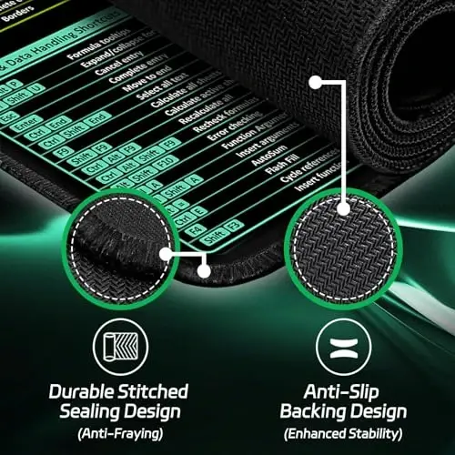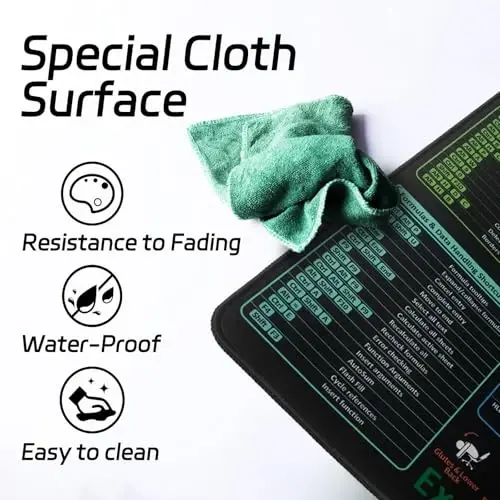Upgraded XXL Size for Serious Workspaces: At 35.4"x15.7", this Excel cheat sheet desk pad gives you more room for your keyboard, mouse, and notes—while doubling as a full desktop protector. Ideal for multitaskers and data pros who need space and shortcuts in one place. All-in-One Excel Shortcuts at a Glance:This Excel shortcuts mousepad features a smartly organized layout of the most used commands and formulas. Boost your productivity without ever needing to pause and search online—everything’s right under your fingertips. Durable, Professional, and Slip-Free:Crafted from high-density natural rubber with stitched edges, this Excel desk mat stays firmly in place and resists wear. The water-resistant surface doubles as a stylish writing pad or mouse surface for daily tasks. Perfect for Learning, Gifting, and Growth:Whether you're heading back to school, onboarding a new employee, or gifting a coworker, this Excel cheat sheet desk mat supports productivity and skill-building. It’s a thoughtful, practical tool for work or study. Easy to Clean, Built to Last:No stress over coffee spills or ink marks—the spill-repellent surface wipes clean in seconds. This low-maintenance mousepad keeps your setup looking sharp day after day.