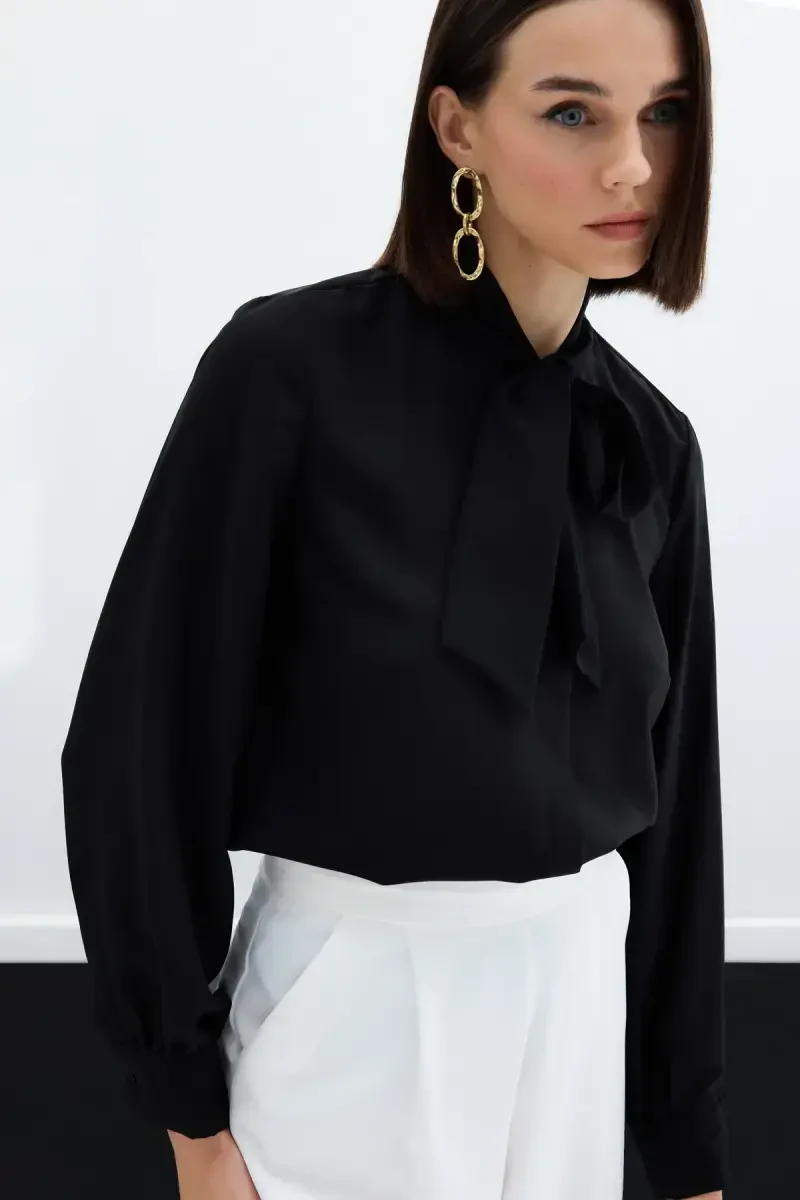 Идеальная для стильного и элегантного образа, Рубашка с завязанным воротником станет незаменимой частью вашего гардероба. Сшитая из мягкой и дышащей ткани, эта рубашка обеспечивает превосходный комфорт для повседневной носки. Ее классический черный цвет прекрасно сочетается с любыми брюками или юбками. Завязанный воротник добавит элегантности вашему стилю. Будь то деловые встречи, ужины или повседневная жизнь, эта рубашка всегда будет отличным выбором.