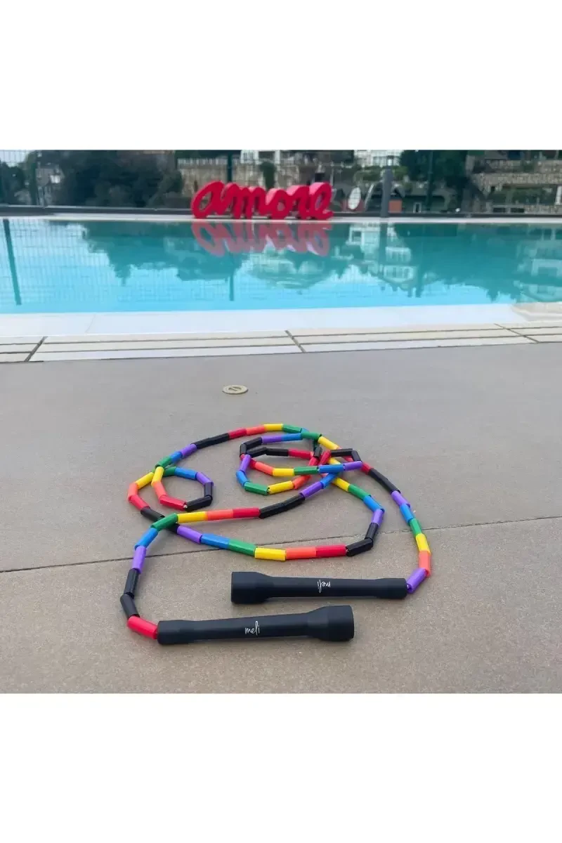 Изготовлен из прочного материала. Ручки с губкой не вызывают потоотделения. Регулируемая длина. Благодаря бисерной структуре обеспечивает более приятный опыт прыжков.**Описание продукта**Добавьте красок своим тренировкам с помощью разноцветной скакалки с черными ручками! Эта скакалка разработана, чтобы обеспечить вам веселую и эффективную кардиотренировку. Благодаря прочному материалу обеспечивает длительный срок службы, а разноцветные бусины повышают вашу мотивацию. Дизайн с черной ручкой придает ей стильный и современный вид. Вы можете с комфортом использовать ее дома, в спортзале или на открытом воздухе. Скакалка подходит для всех уровней подготовки, идеально подходит как для начинающих, так и для опытных спортсменов. Помогает улучшить координацию, укрепить мышцы и сжечь калории. Благодаря бисерной структуре вы можете лучше чувствовать скорость вращения веревки и легко улучшить свою технику прыжков. Благодаря эргономичному дизайну ее удобно держать в руке, а губчатые ручки, не вызывающие потоотделения, обеспечивают комфорт на протяжении всей тренировки. Регулируемая длина позволяет регулировать длину веревки в соответствии с вашим ростом, обеспечивая более эффективную и безопасную тренировку. Разноцветные бусины придадут вам энергии с каждым прыжком и сделают вашу тренировку более приятной. Сделайте шаг к здоровому и веселому образу жизни с разноцветной скакалкой с черными ручками!**Характеристики продукта*** Изготовлен из прочного материала.* Ручки с губкой не вызывают потоотделения.* Регулируемая длина.* Благодаря бисерной структуре обеспечивает более приятный опыт прыжков.* Разноцветный дизайн бусин повышает мотивацию.* Дизайн с черными ручками обеспечивает стильный и современный вид.* Подходит для всех уровней подготовки.* Улучшает координацию.* Укрепляет мышцы.* Помогает сжигать калории.* Эргономичный дизайн обеспечивает удобный захват.* Можно использовать дома, в спортзале или на открытом воздухе.* Облегчает ощущение скорости вращения веревки.* Обеспечивает безопасную и эффективную тренировку.**Дополнительная информация**Вы можете использовать механизм на ручке, чтобы отрегулировать длину скакалки. Вы можете продлить срок службы веревки, аккуратно храня ее, когда она не используется. При регулярном использовании скакалка поможет улучшить ваше сердечно-сосудистое здоровье и повысить общий уровень физической подготовки. Изделие можно чистить влажной тканью.