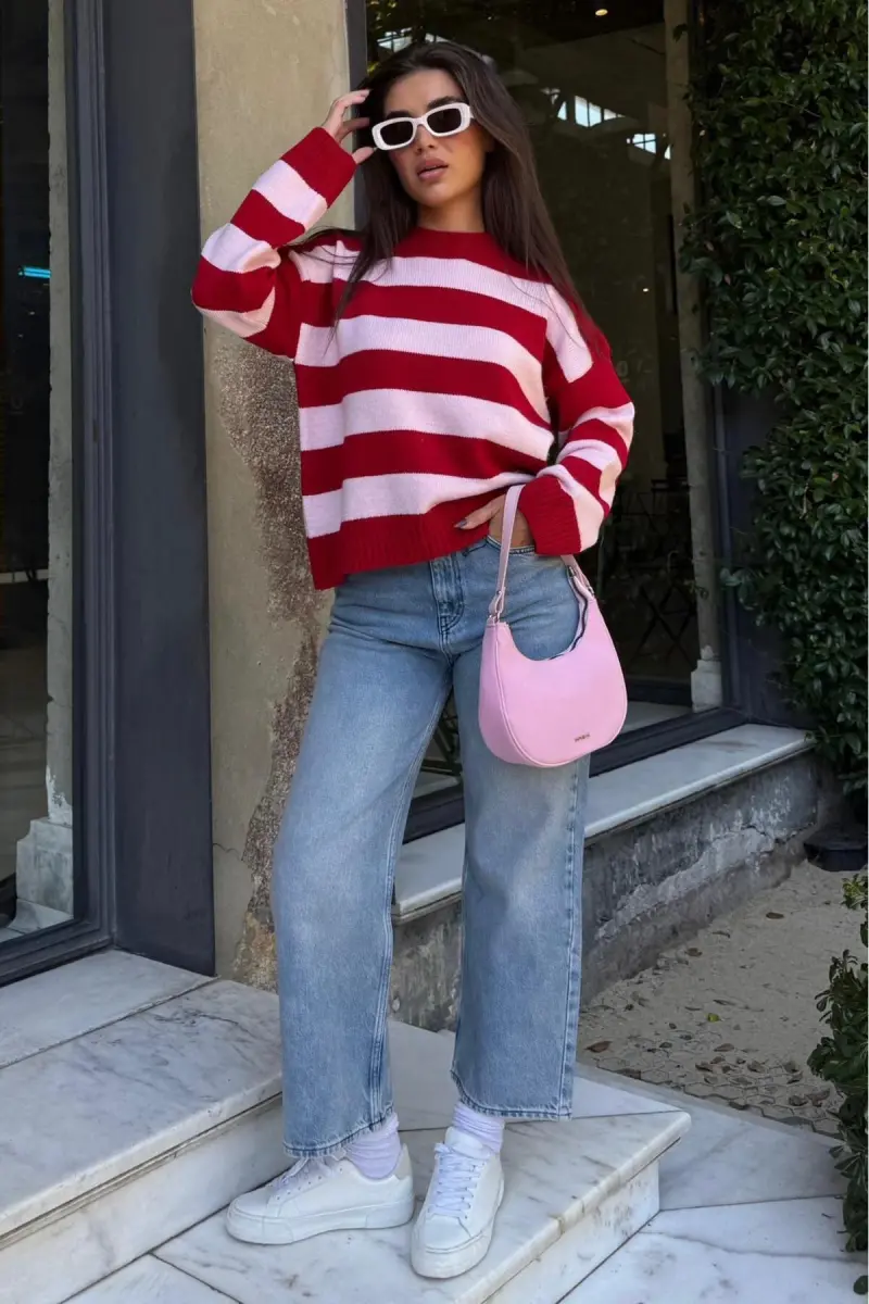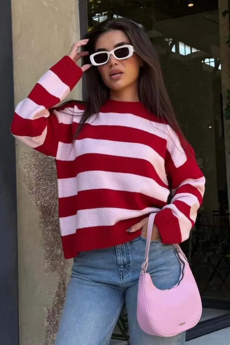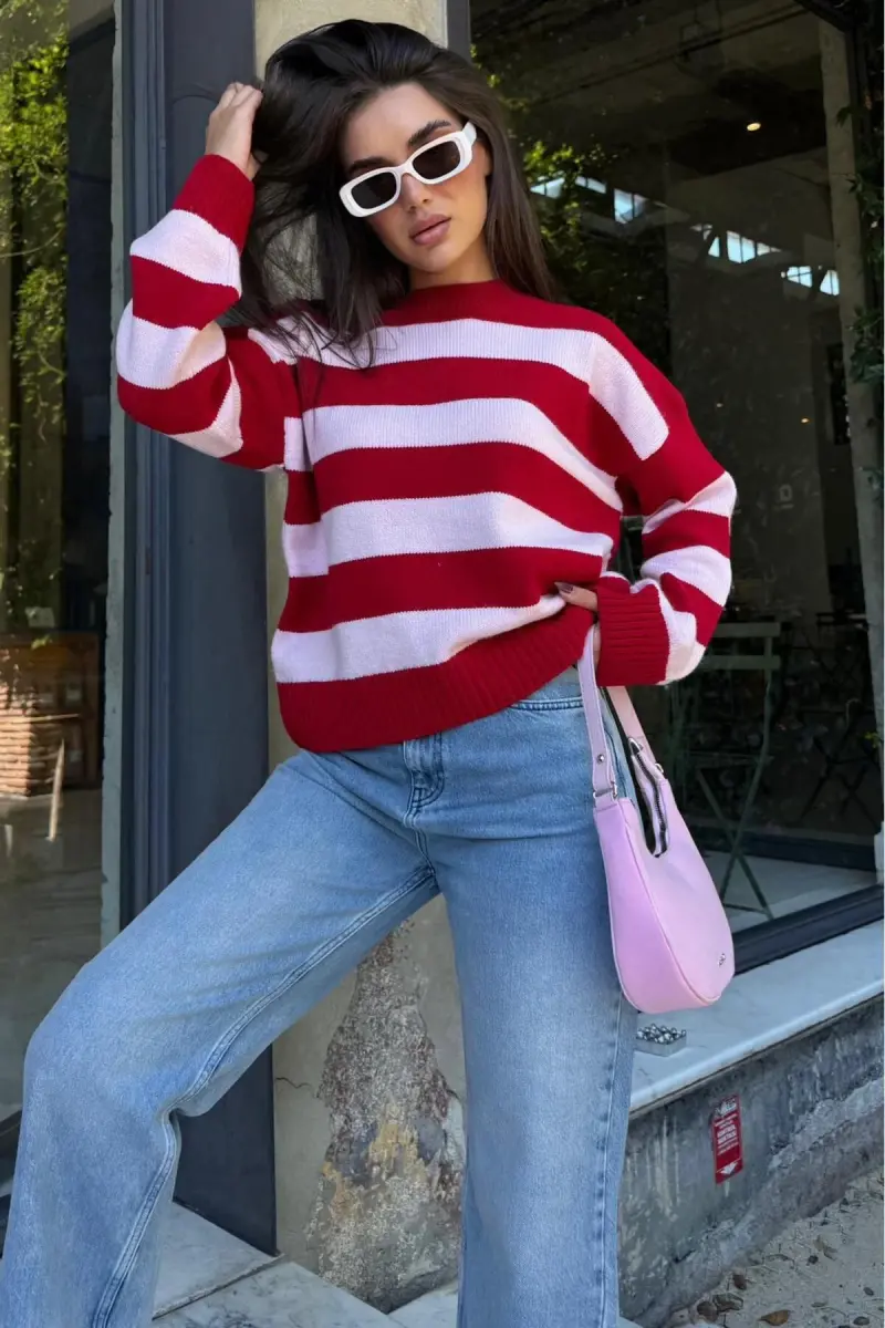 Pudra Bisiklet Yaka Çizgili Oversize Triko Kazak MG1972-Pudra1
