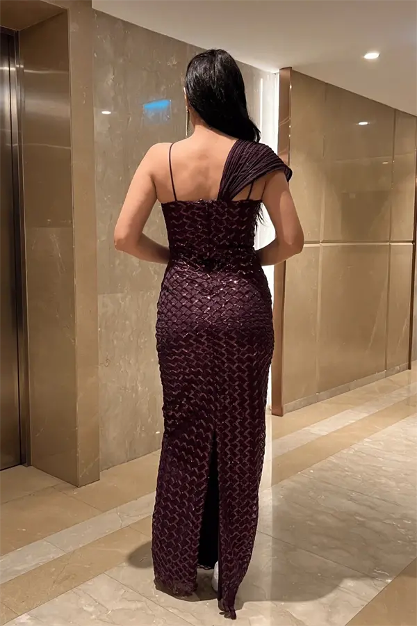 Pul Payet Kumaş Şal Detaylı Abiye Elbise - PATLICAN MOR
